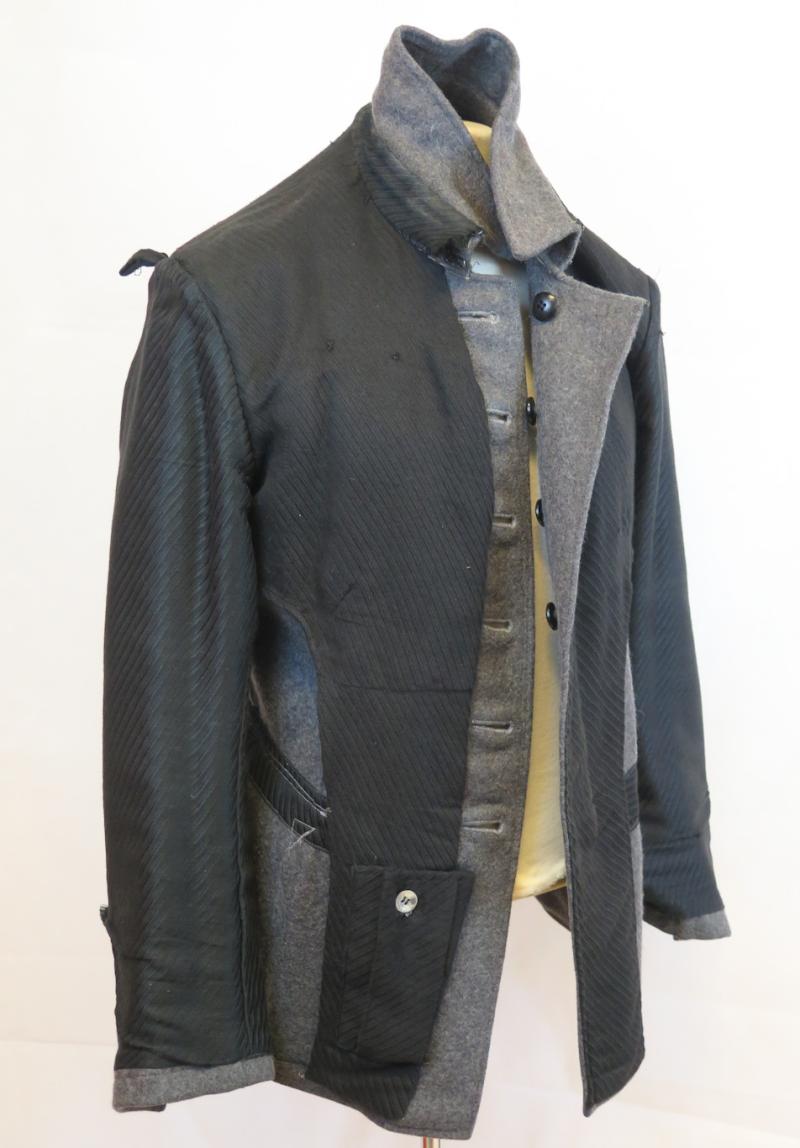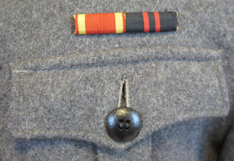 FIN 2MS Suomen armeijan M36-asetakki. Harmaata sarkakangasta, hyvä laatuista villaa. Olkapoletit pyöreä reunaiset. Takki n.1940-41 valmistetta. Bakeliitiset mustat siviilimallin napit, olkapoleteissa leijona-napit. Vasemmassa taskussa merkin jälki ja oikealla rintataskun läpässä. Erittäin hyväkuntoinen takki. Erikoinen musta vuori, meillä on ollut aiemmin samanlainen takki. Rinnassa kunnimerkki nauhat, VM2 ja TSMM. Hyvä 2MS aikainen takki kokoelmaan!