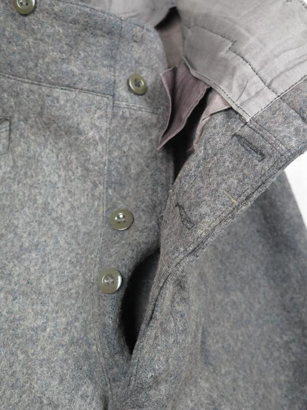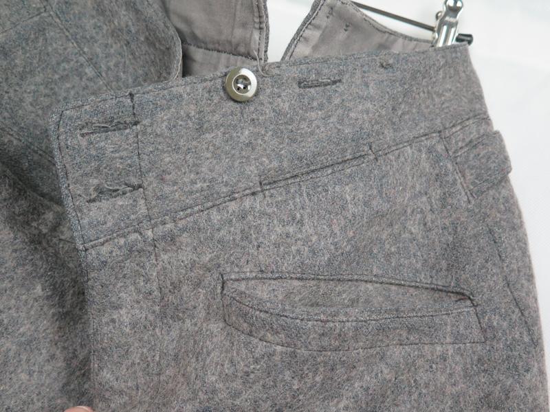 ENG WW2 Finnish M/36 uniform trousers. Straight leg grey wool serge trousers. Minimal worn pair . Trousers marked inside, size 56 A, SA, Int 44, M(sold) and maker "Turo". Green bakelite buttons, two buttons missing from fly and one from waist. Rather rare pair of trousers, that impossible to get when needed. Excellent pair to complete finnish soldier display!