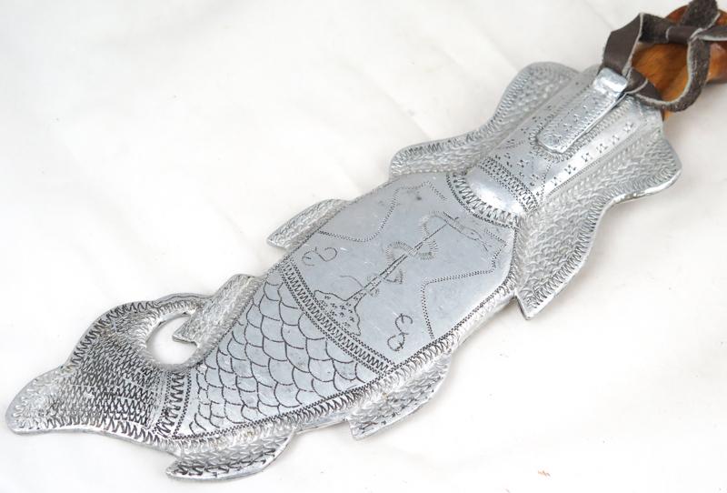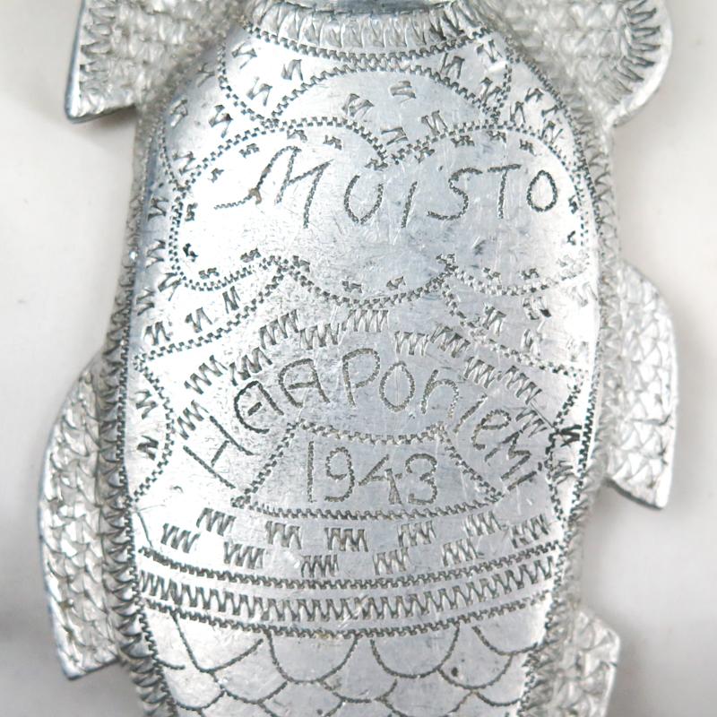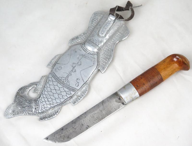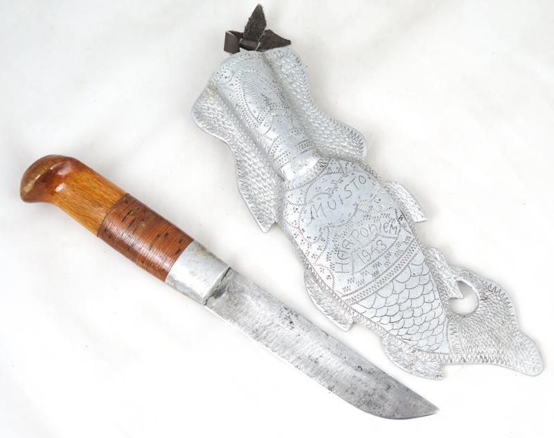 ENG WW2 Finnish trench-art sheath and puukko-knife. Aluminium made sheath. "Fish" shape Written "Muisto Haaponiemi 1943". Motive on back. medical emblem. Puukko with wooden handle. Leather string. Blade is used and no markings. Nice, trench-art sheath and knife, been together set.