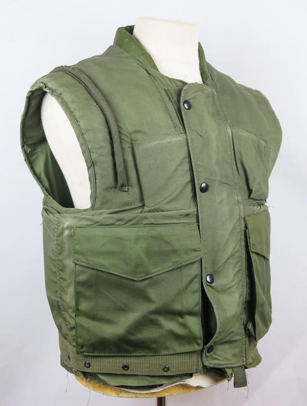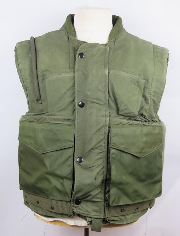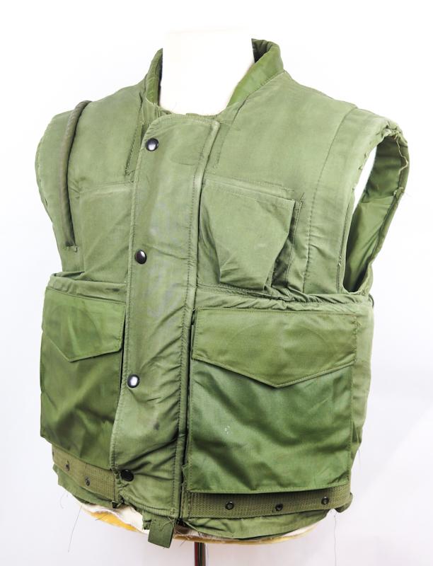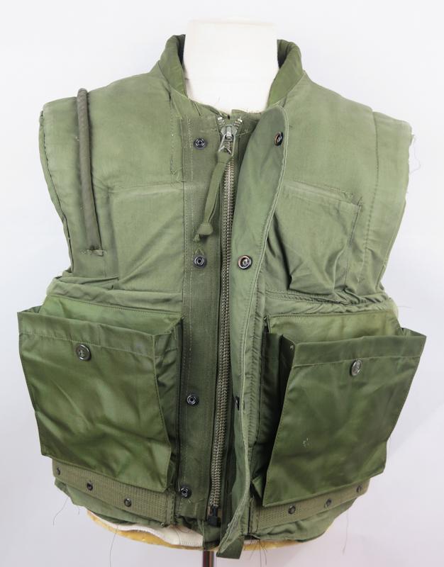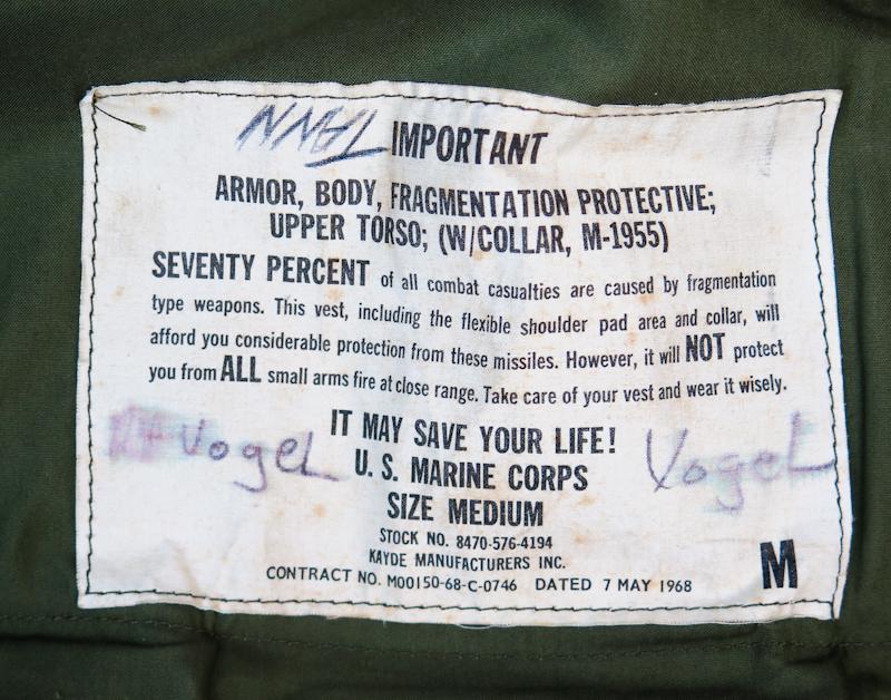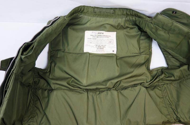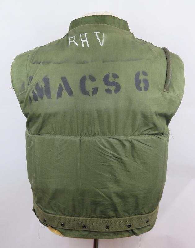 ENG Vietnam war period US marines M1955 body armor vest. 2nd pattern vest with date 1968. Size medium. On back stencilled MACS 6 (Marine Aviation Control Squadron 6?) and white painted initials. Collectors item, only for dsiplay Good condition vest with good date.