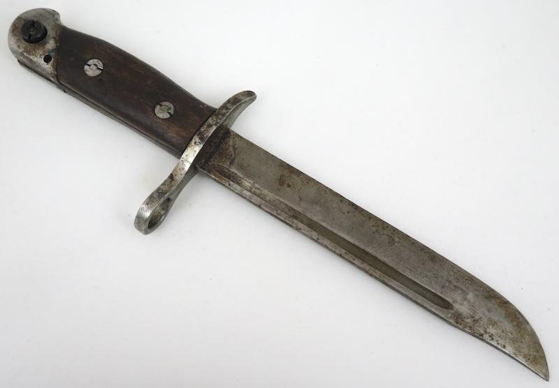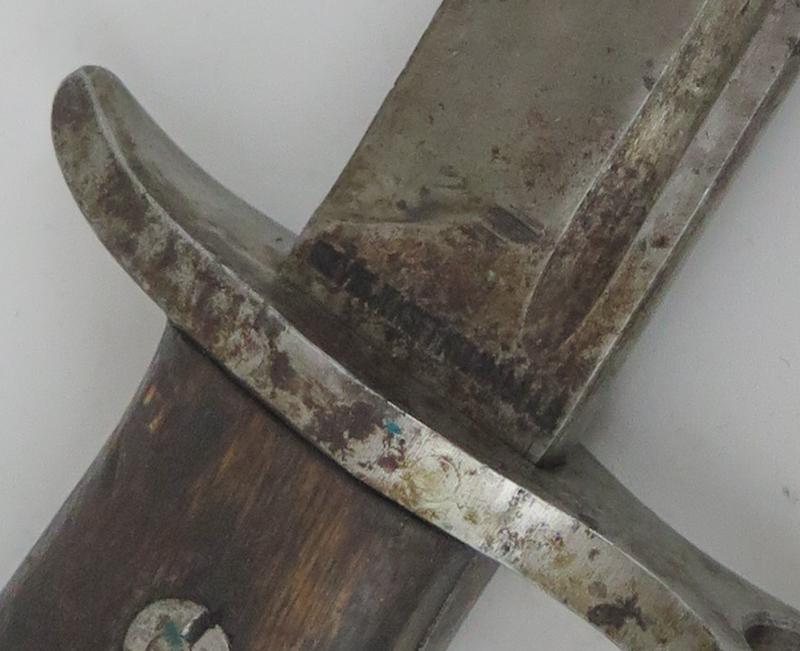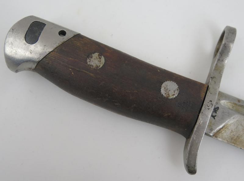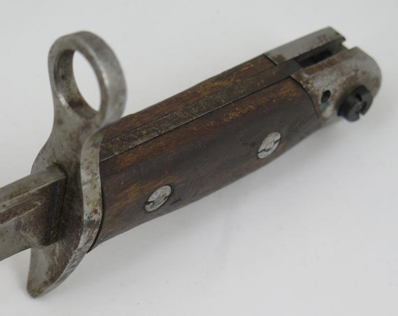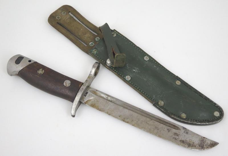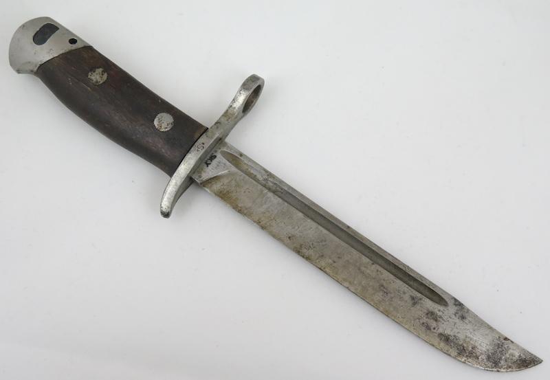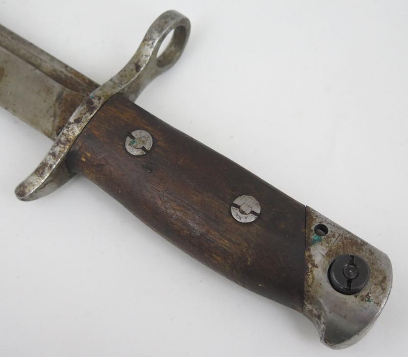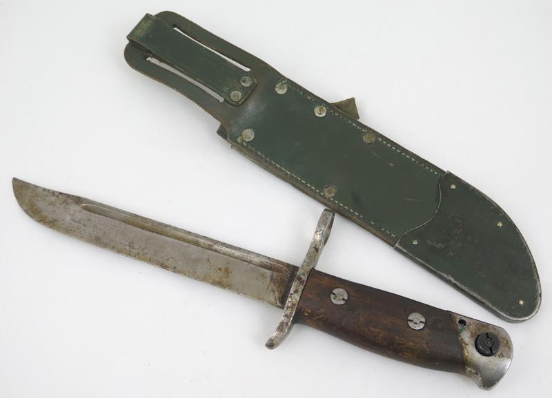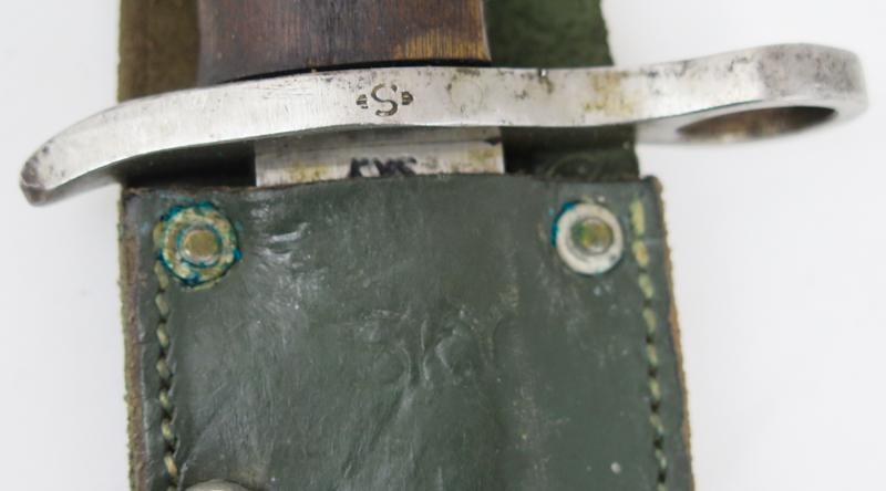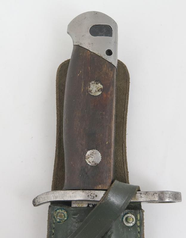ENG WW2 Finnish M/39 knife-bayonet. Made by Veljekset Kulmala. Civil guards acceptance stamps on hilt. "Sky" on blade. Wooden parts in good condition. Green leather scappard with civil-guard stamp, Sky. Old grease on blade. Nice, original bayonet!