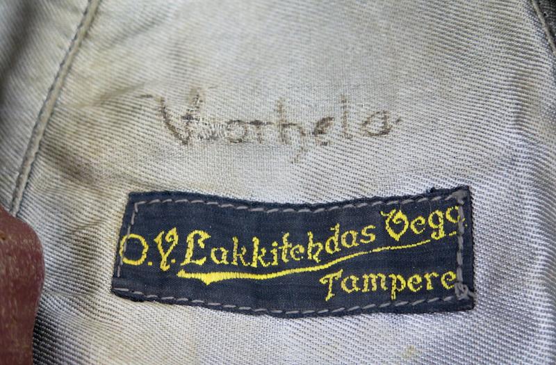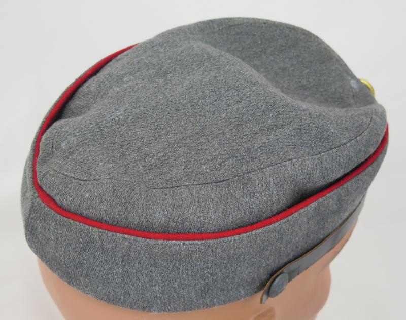ENG WW2 Finnish M/39 Summer cap, sidecap. Grey colored, made from gabardine wool cloth. Red soutache at cap turn-up for artillery. Officer cocade. Chinstrap buttons grey colored. Chin strap made from grey leather. Lining is grey colored. Sweatband is leather. Mker Vega, Tampere. Name Vuorhela inside. Cap size is about 56. Nice, original, good condition cap!