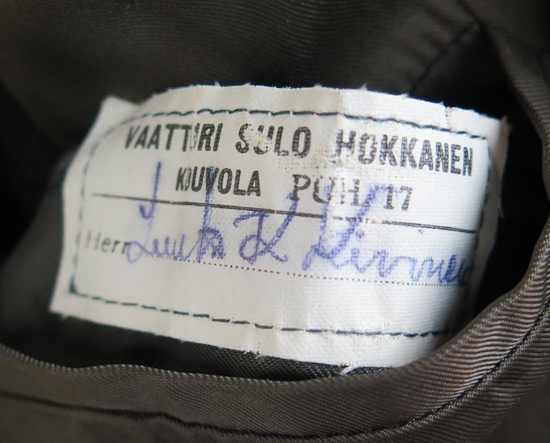 ENG WW2 Finnish army infantry captain field jacket M/36. Tailor made jacket. Tailor label inside officers name inside. Jacket with infantry (green/grey) captain collartabs. One lower pocket button replaced with bakelite button. Jacket in good to fair condition. Nice, original finnish infantry officer jacket!