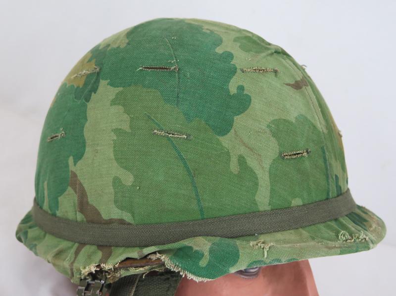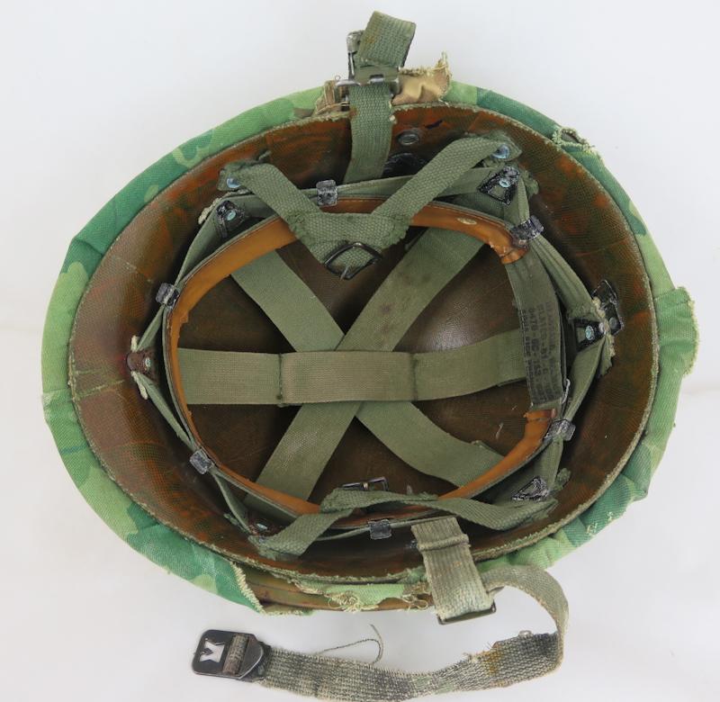 FIN 1950-60 lukulainen US armeijan M1 laskuvarjojoukkojen teräskypärä. 1960-lukulainen Vietnamin sodan aikainen kypärä. Oliivin vihreät laskuvarjojoukkojen remmit ja "mitchell"-maastokuvio päällinen. Kypärän kupu 1950-lukulainen Mccord valmistama kypärä, erä numero "M 341 A" Sisäkypärä lakuvarjojoukkojen mallia , päivätty 1967, sisäkypärän nahkainen hikinauha 1980-lukulainen. Maastopäällinen varhainen puuvilla versio, 1960-luvun alkupuolelta, päällisessä repeämä sivussa. Kypärää kiertavä kuminauha on uudempi ja ilman US merkintöjä. Hyvä, aito US armeija kypärä.