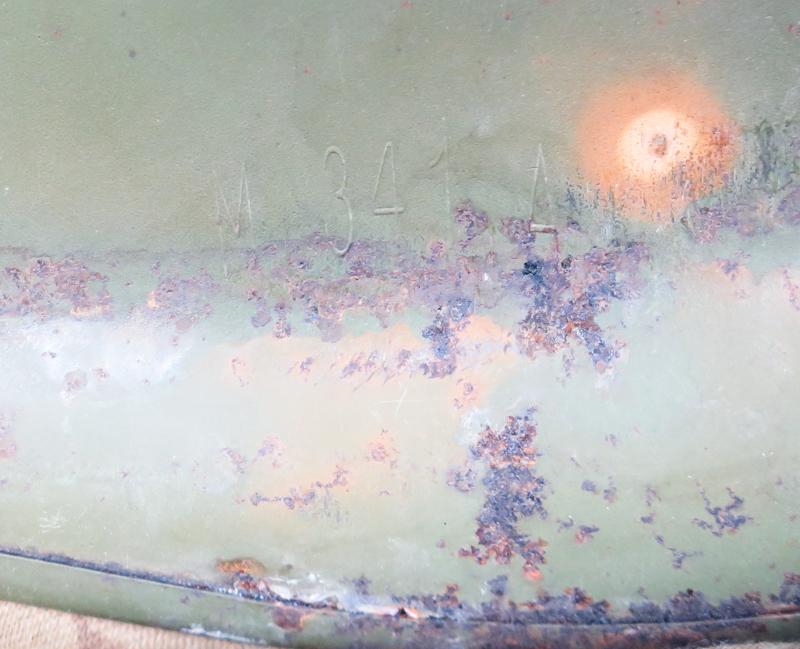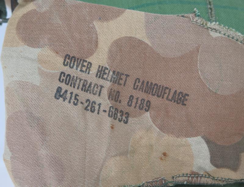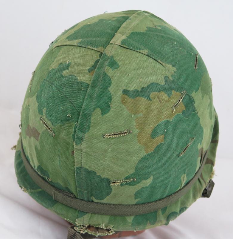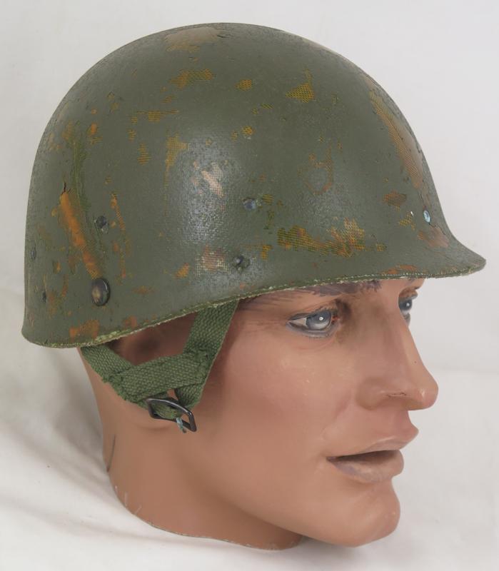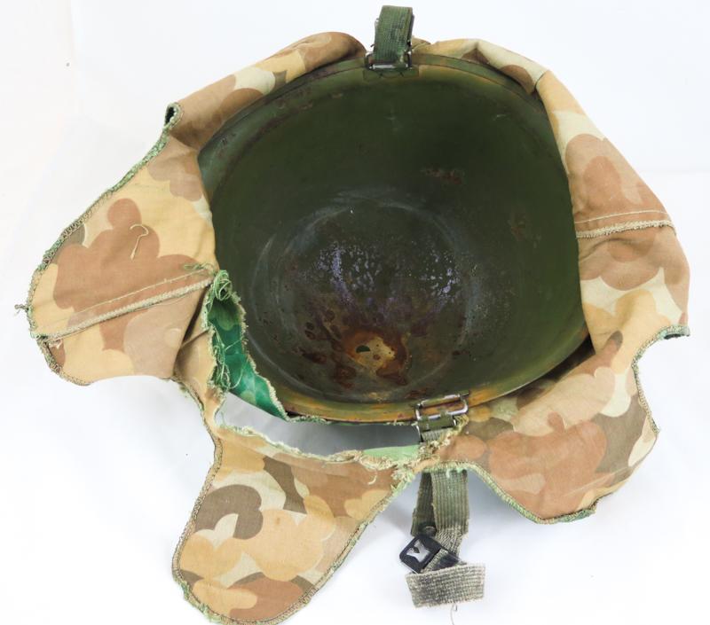 ENG 1950-60s US M1 Parachutist steel helmet. Olive-drab para straps. Helmet shell is 1950s Mccord, batch number " M 341 A". Helmet with "mitchell" camo cover made from cotton twill, early 1960s. Helmet cover is torn from a side . Helmet liner para type, dated 1967. Leather sweat band is from 1980s. The foliga band is modern replacement with out US markings. Nice, original US steel helmet.