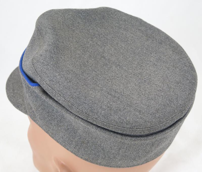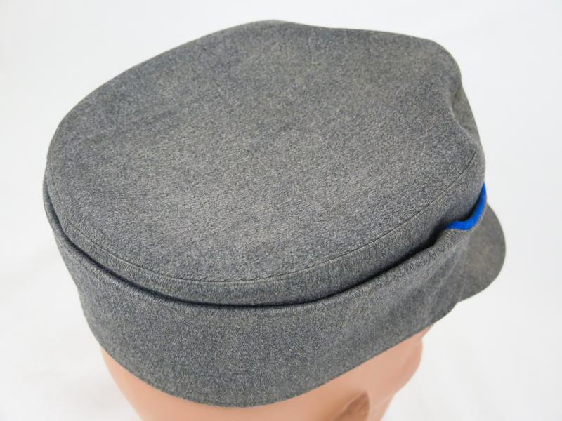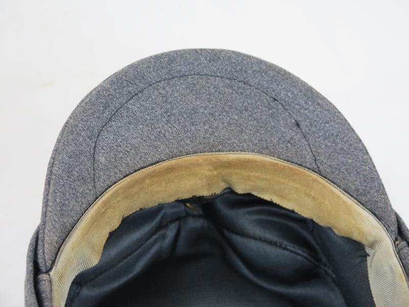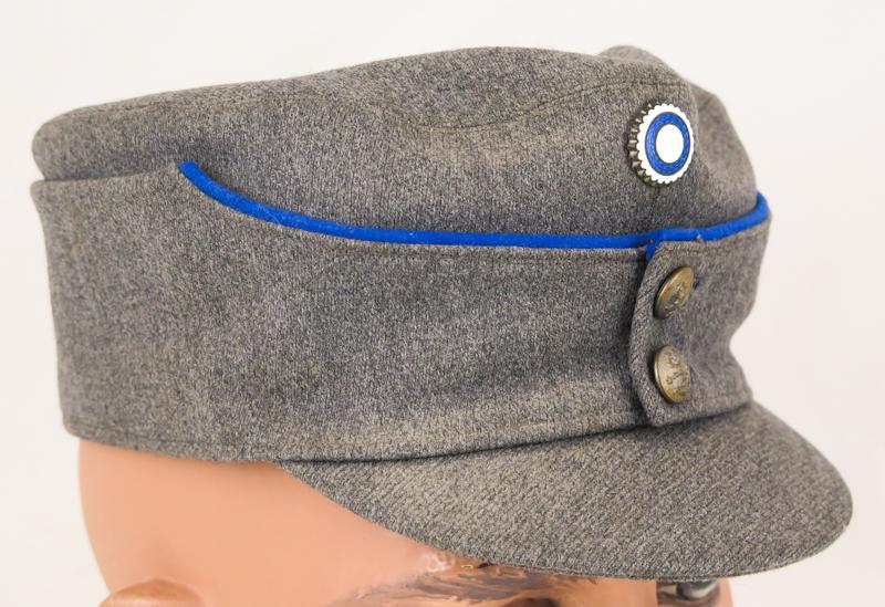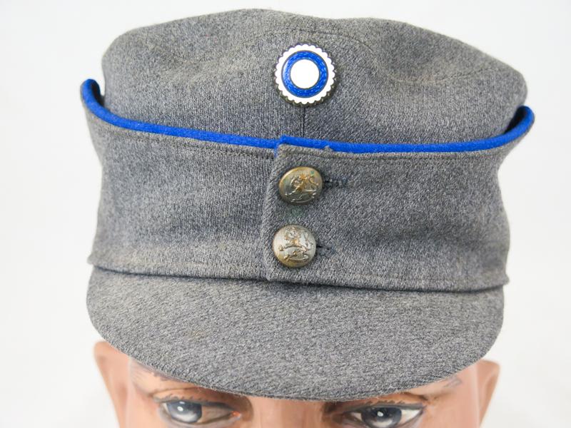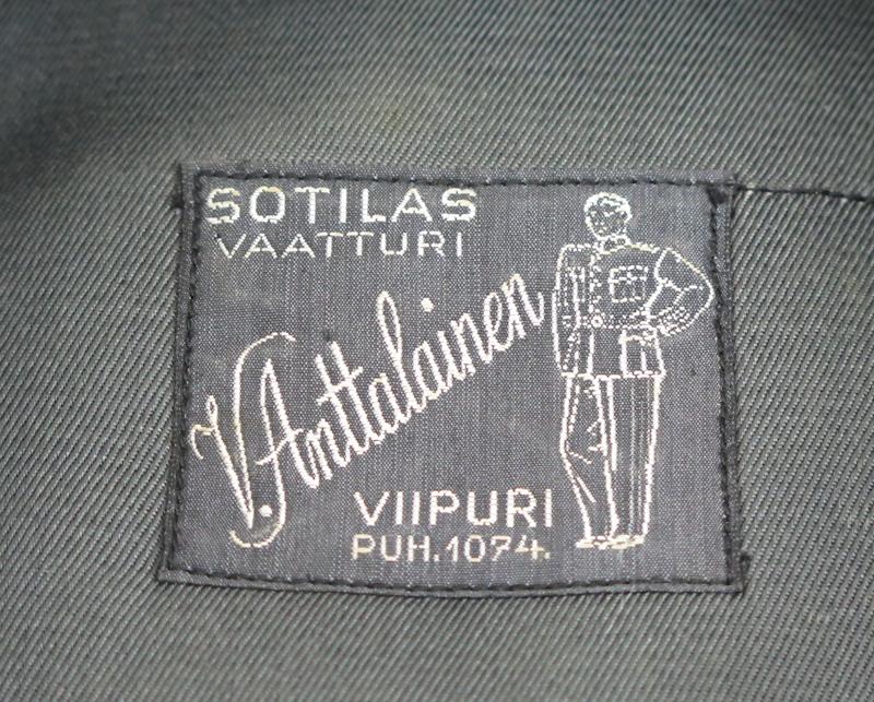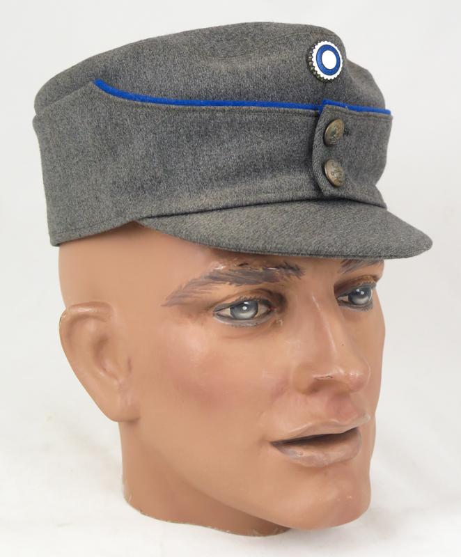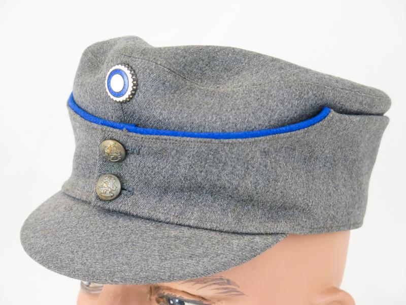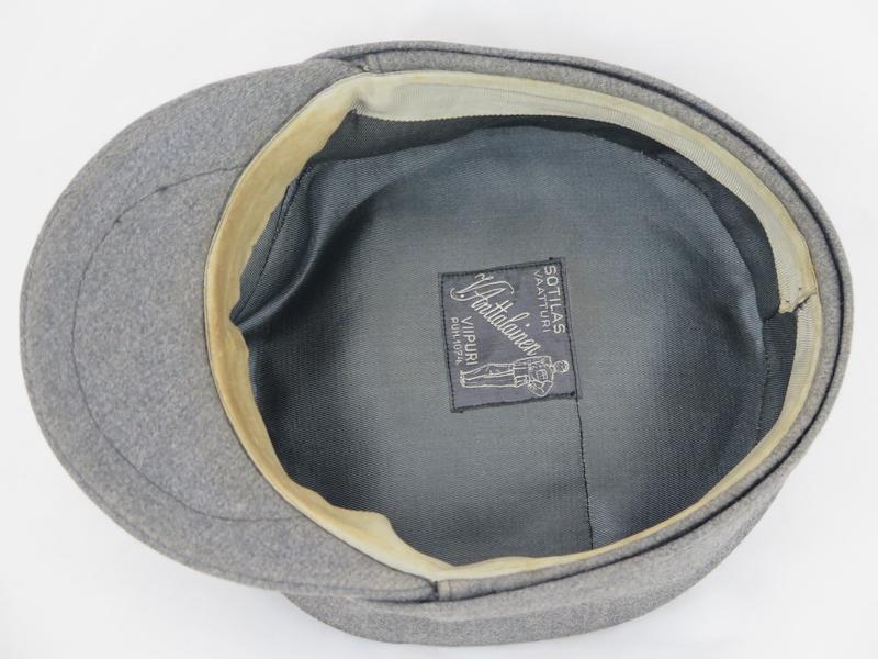 ENG Finnish WW2 fieldcap M36. Grey wool cabardine cloth cap. Blue soutache around cap front for airforce or supply branch. Cap is marked by maker "V.Anttalainen, Viipuri" label, which dates cap for late 1930s made. Enamel cocade for officers or NCOs. Light grey cloth sweatband. Grey lining. Size about 56. Metal buttons. Officer cap cocade. No moth nips. Used, very good condition cap for finnish WW2 Airforce or supply.