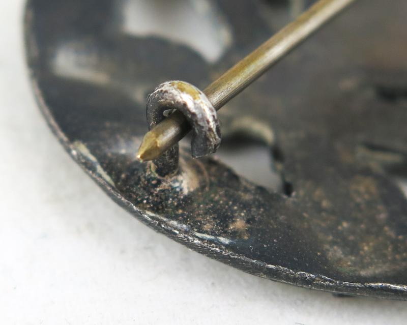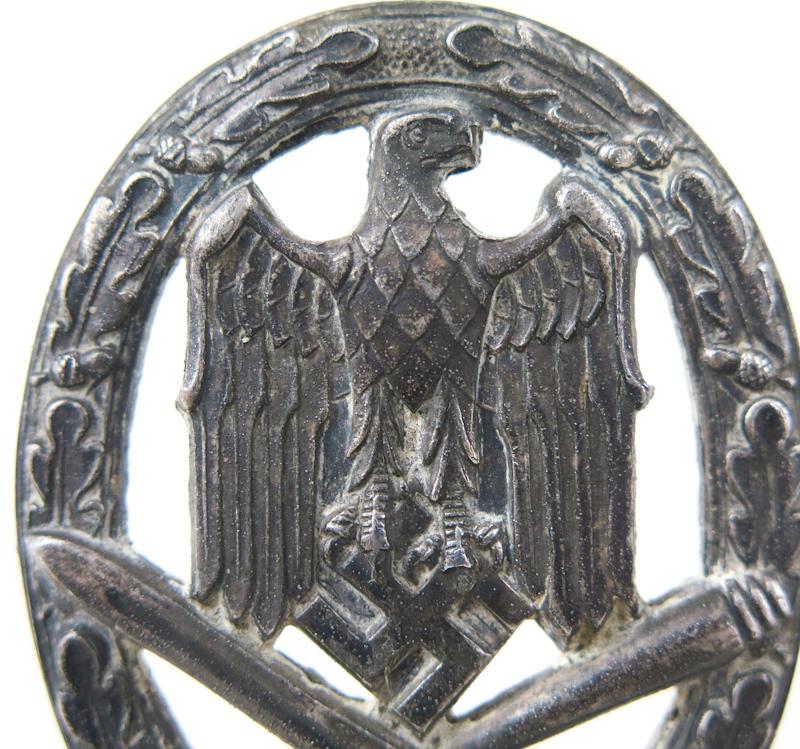 ENG WW2 German General assault badge (Allgemeine Sturmabzeichen). Silver colored. Zink version, silver wash worn, zink pest on badge. Crimped-ball type. Maker known as Rudolf Karneth. Good to fair, original badge.