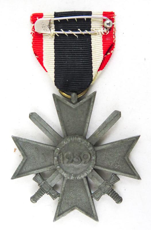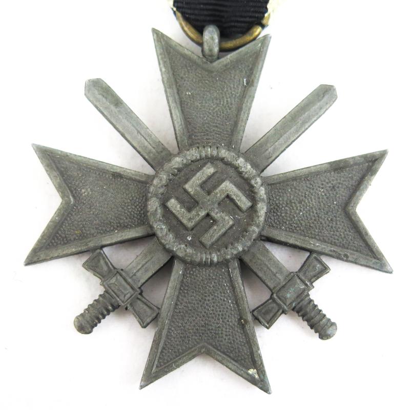 ENG WW2 German War merit cross 2nd class, Kriegs Verdienst Kreuz. 2nd pattern medal 1943 -45. Zink made award. Typically for these late type awards the bronzage is worn. Ribbon with sewn "Prym" safety needle. Good, original cross.