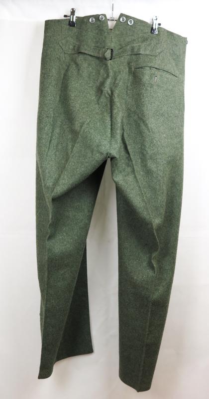 FIN 2MS Saksalaiset Wehrmacht/Waffen-SS M40 suorat housut. Vihreät villakangas housut. Hyvä kuntoiset, käyttämättömät housut, joissa saksalaiset merkinnät. Valmistaja "Augustinus & Hansen A/S", tanskalainen monialayritys, valmistettu heidän omistamassaan tehtaassa. Vyötärön koko merkitty 94cm, varikkoleima St42 = Stettin 1942. Kaikki napit tallella. Housuissa jonkin verran käsittellyn villan tuoksua ja tuntua. Saksalaiset housut ovat erittäin harvinaiset. Hienot, hyvät, aidot housut!
