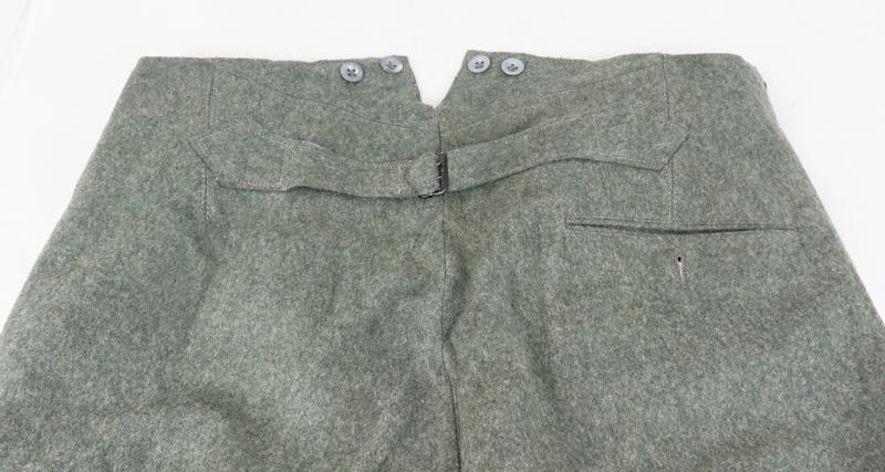 ENG WW2 German Wehrmacht/Waffen-SS M40 trousers. Field grey wool trousers. Excellent, unissued condition. German markings, occupation period maker "Augustinus & Hansen A/S", an danish conglomerate company and made in their owned clothing factory. Waist marked 94cm, depot St42 = Stettin1942. all buttons present. Very good condition trousers, slight odour and feel from wool treatment from the period. Nice pair impossible to upgrade. Rare pair!