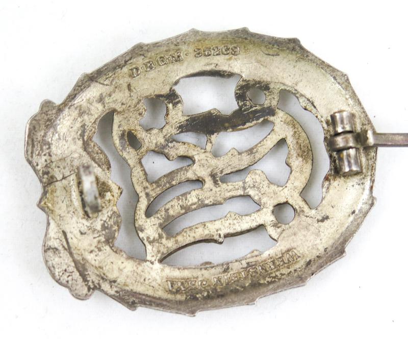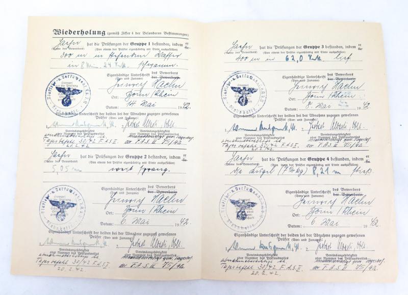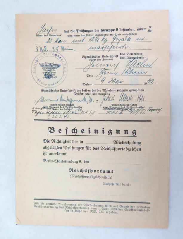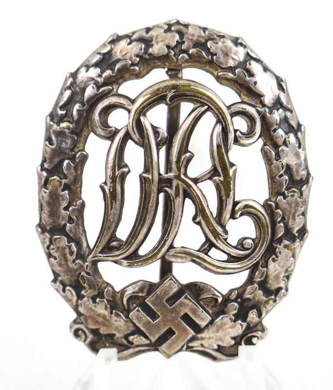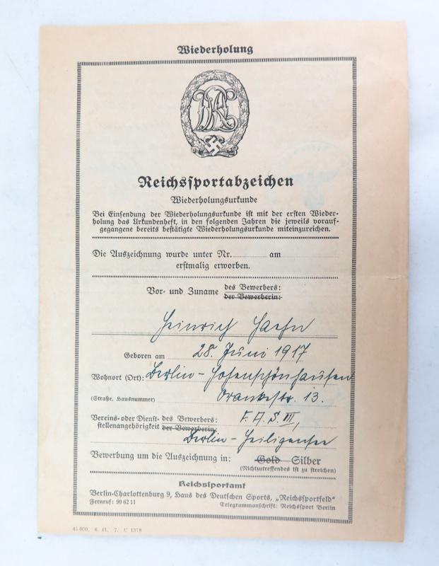ENG WW2 German National sport badge. 2nd class in silver with award document. Badge having monogram "DRL" = Deutscher Reichsbund für leibesübungen. Badge maker marked Wernstein, Jena. Award document foldable, inside sporting entries. Achieved the silver grade. Good original badge. Universally worn by soldiers.
