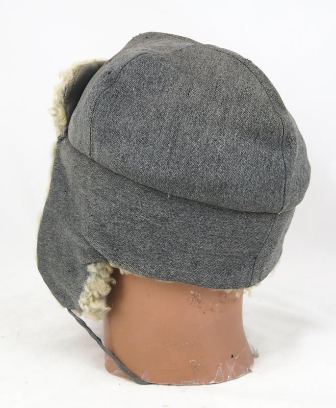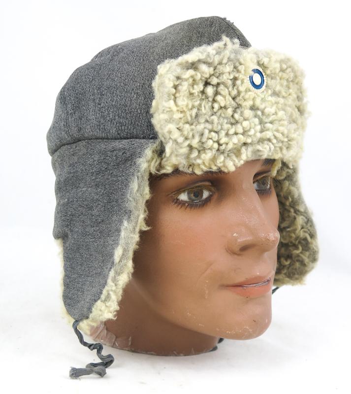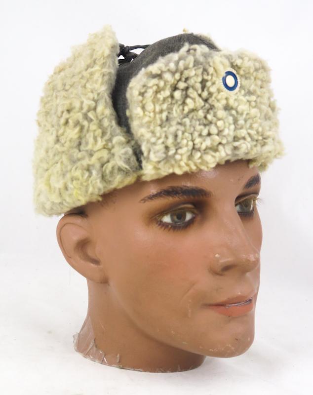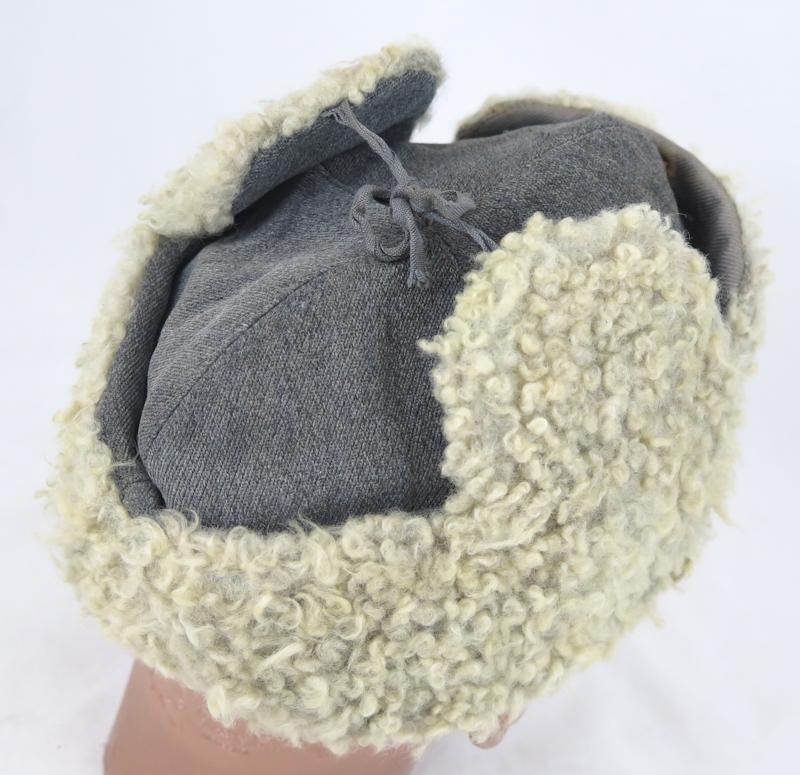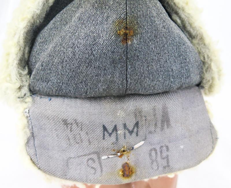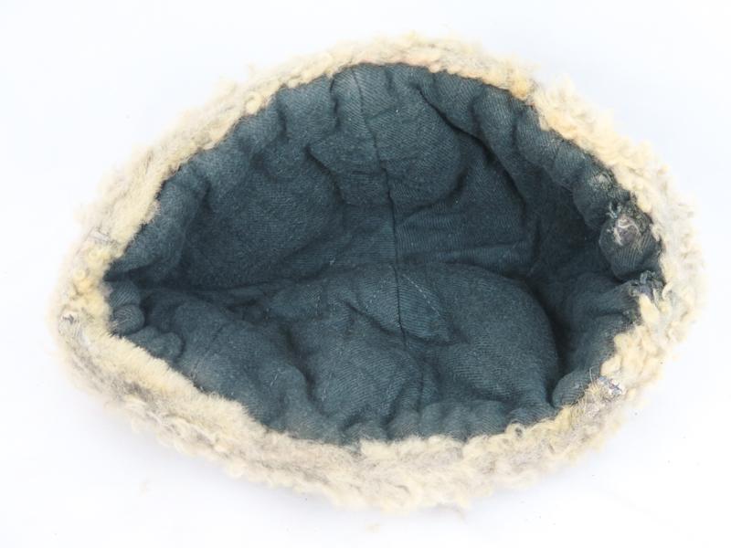 ENG WW2 Finnish M/39 fur cap. Grey cloth with whitish fur at side. At front of EM/NCO cocade. Grey-green lining. Maker marked behind front flap, VPu, SA-mark, size 58 (shrinken to 56), int44(1944), and douple MM ( sold and abolished) stamp. Fair, used, fur cap!
