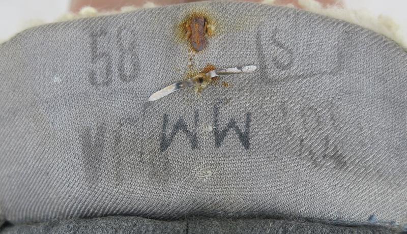 FIN 2MS Suomen armeijan turkislakki M/39. Harmaa turkislakki, missä vaalea turkis. Edessä miehistön kokardi. Harmaa-vihreä vuori. Merkinnät etuläpän takana, koko 58 (kutistunut kokoon 56), SA-leima ,VPu int44, M M merkintä (myyty ja mitätön). Käytetty, kohtuullinen turkislakki!