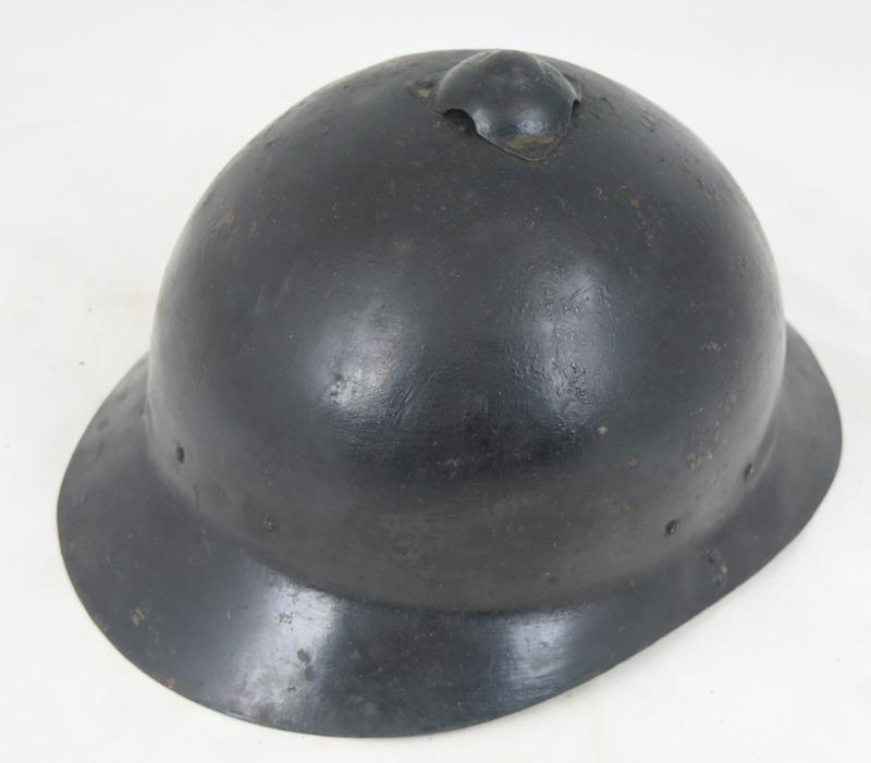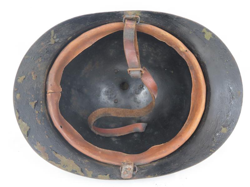 ENG Finnish manufactured helmet M17 for Imperial Russia. Made by company G.W.Sohlberg. Black painted for civil defense and fire brigade use. Finnish 1920s civil defence leather liner partly present Leather chin strap, broken.Black paint is flaking, showing original green paint. Reasonable looking helmet for display!