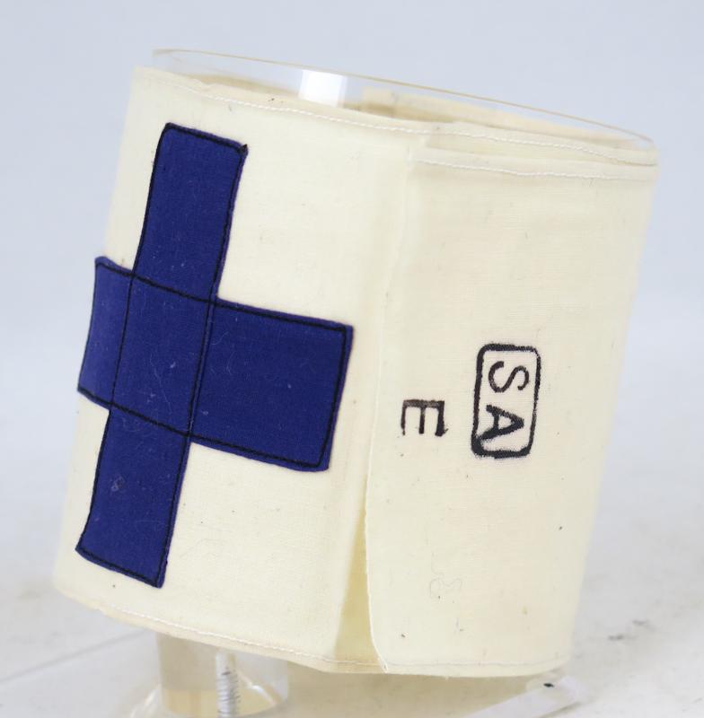 ENG WW2 Finnish armed forces blue-cross armband for vetenerian personnel. Stamped SA-stamp (Finnish army property stamp)and Letter "E" for Eläinlääkintä(vetenerian). Unused. Last image showing WW2 use.Unusual armband!