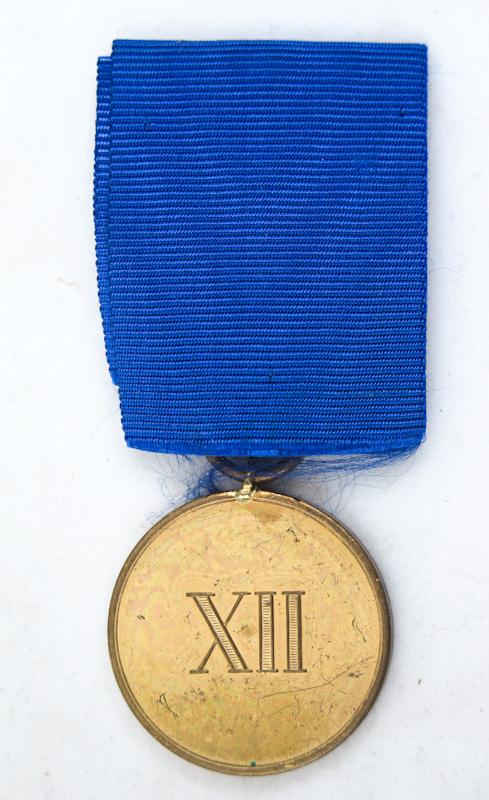 FIN 1MS Saksan Preussin asevoimien 12.Vuoden palvelusmitalli miehistölle ja aliupseereille. Pronssin värinen mitalli. Sininen nauha. Kulunut paikoin, patinaa. Hyvä, aito, merkki.