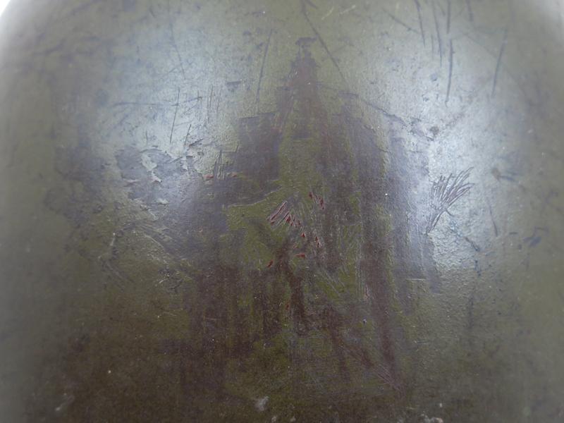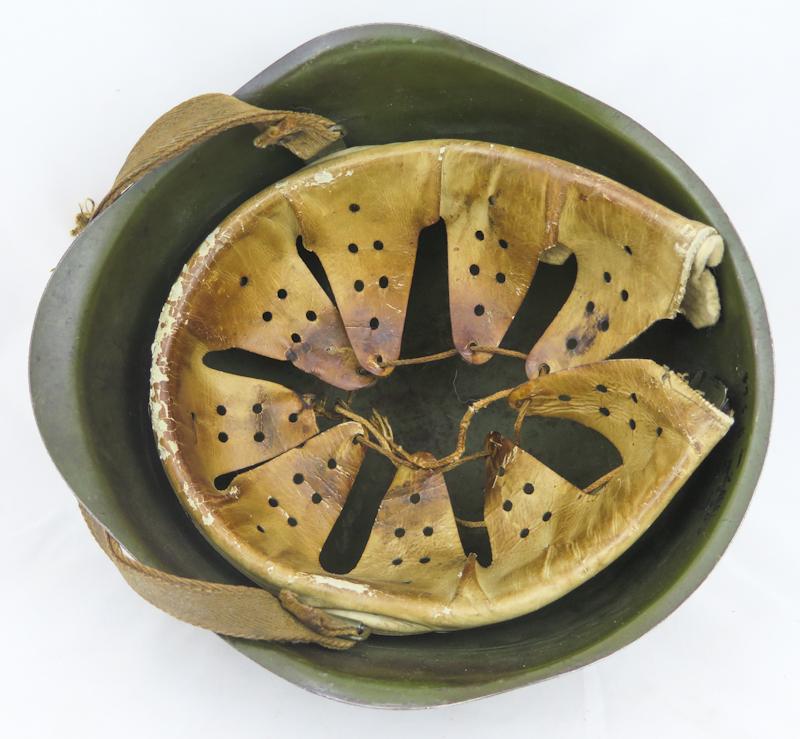 ENG WW2 Soviet steelhelmet SSh-39. Green original paint. Red star from front of helmet scratched away, outline of star visible and some remains of original red paint. Very small dent at side of helmet from a bullet. Liner rare white leather version, the liner band has gut broken and back band also. Black ink marking readable "POCT 2, 1939", marking on shell "2 1976"at back of helmet. Khaki strap, metal parts rusted. Removed red star indicate finnish army use during WW2. Scarce, original Soviet helmet from beginning of WW2!