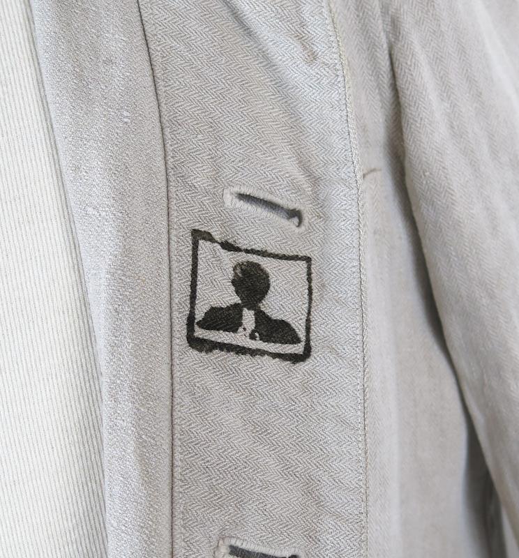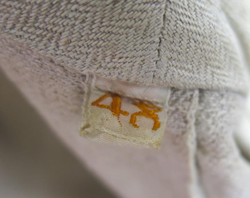 FIN Saksalainen vaalea työtakki. Drillich kangasta. Puserossa on 1MS työtakin ominaisuuksia, mutta pieniä poikkeamia. Napit ovat tyyppiä, joita on usein Reichswehr takeissa. Sisäpuolella Wehrmacht kotka leima, mutta epäilen sen aitoutta. Sisällä koko lappu 48. Erikoinen.