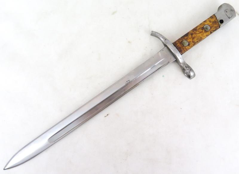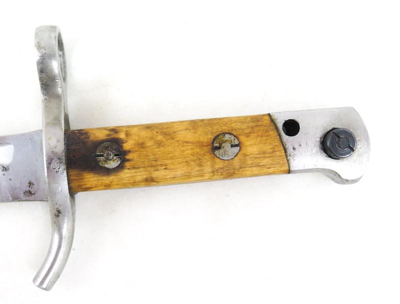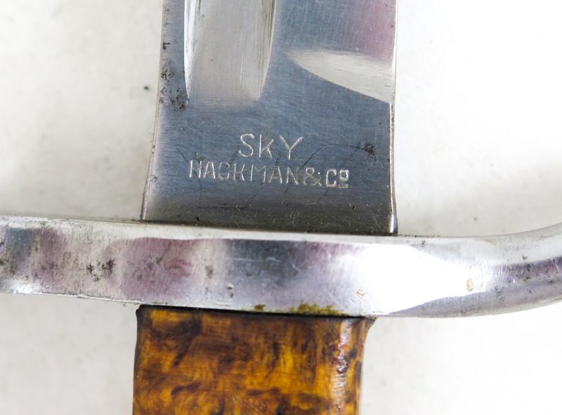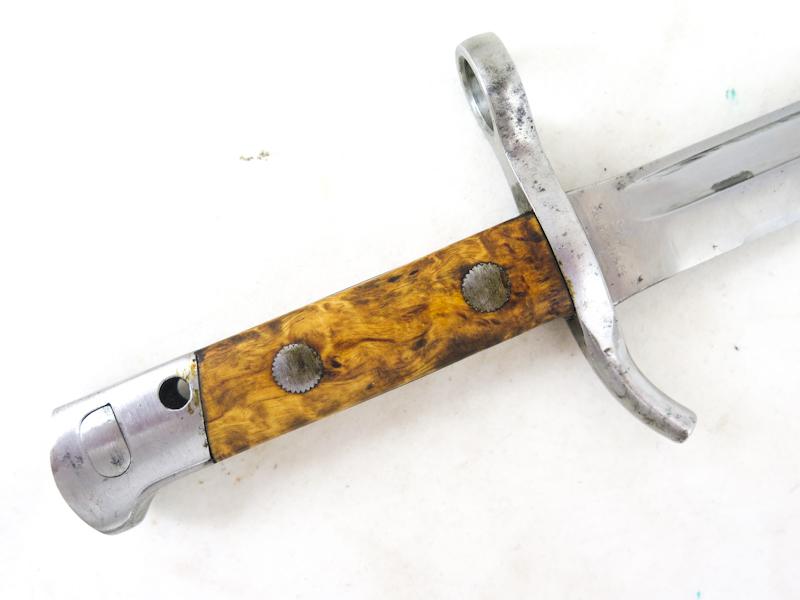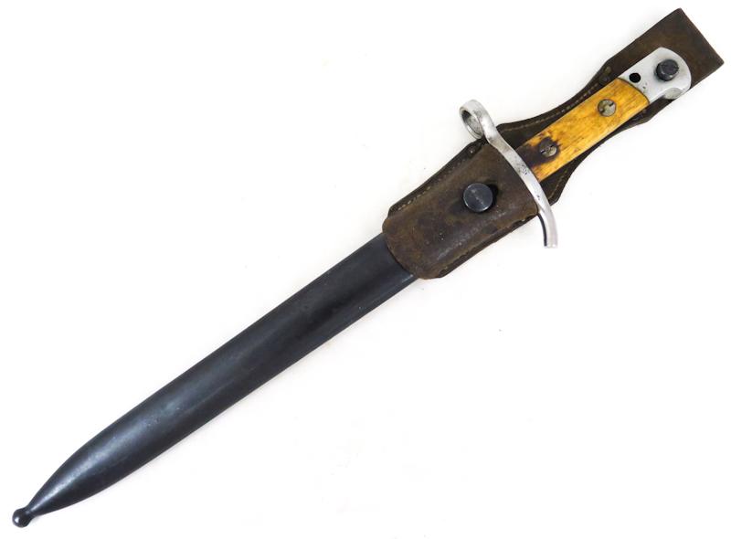 ENG Finnish pre-war made bayonet for Civil guards M/28-30. Blade of the bayonet is good. Sheath in good condition. No sharpening to blade. Hilt has Civil guards acceptance stamp "=S=". Unnumbered without Civl guard district serial. Bayonet is made by Hackman and marked SkY. Leather frog is WW1 german made and in good shape. Brown leather. Maker mark unreadable, date 1918 visible. Good bayonet NOTE: Before ordering please check your countrys possible restrictions for import of bayonet.