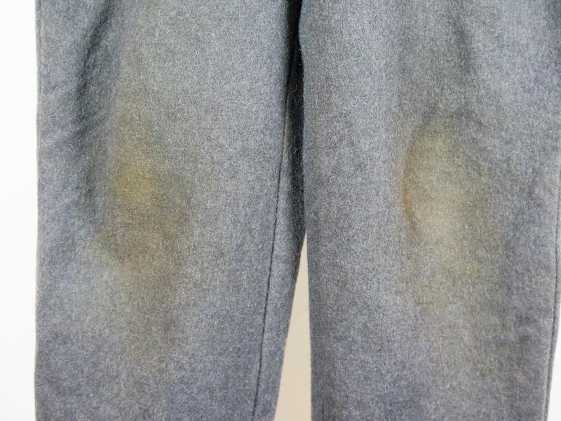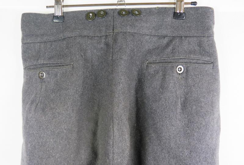 ENG Finnish M/36 uniform trousers. Straight leg grey wool serge trousers. Worn and used pair . Trousers marked inside, size 48 B, SA 61 (1961), M(sold) and maker VPu. Grey plastic buttons. Some repairs and markings. Nice issue pair in affordable price. Good pair to complete finnish soldier display!