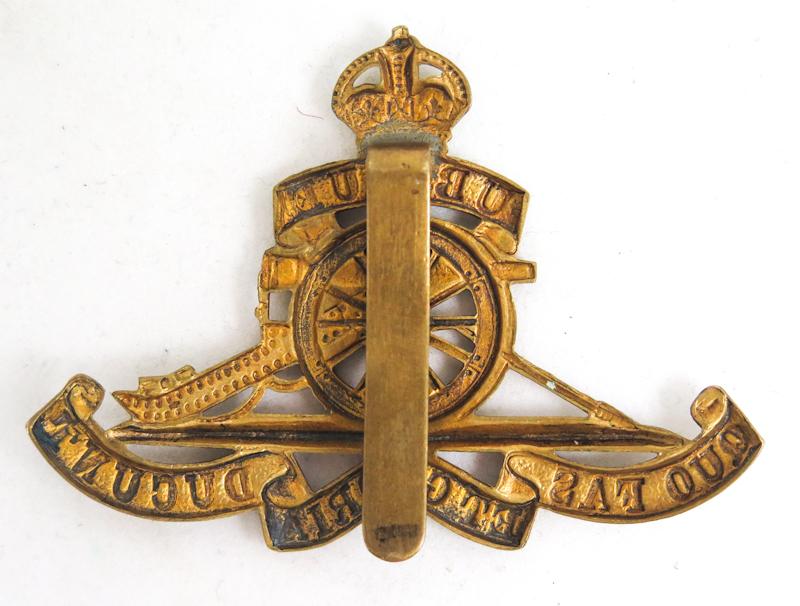 ENG WW2 British army cap badge of Royal regiment of Artillery. Pre-WW2 made from brass. Maker mark on a hook. Metal hook for attachment. Nice WW2 cap badge.