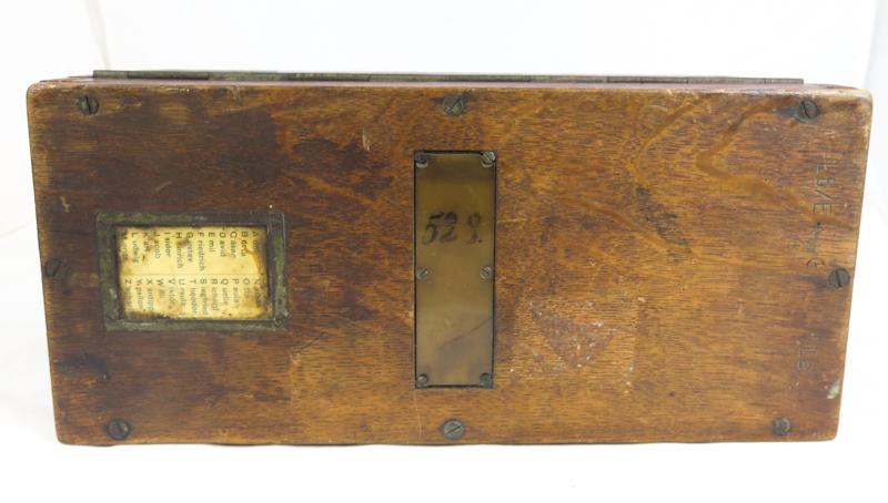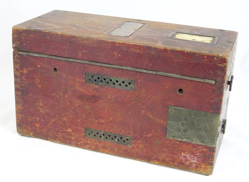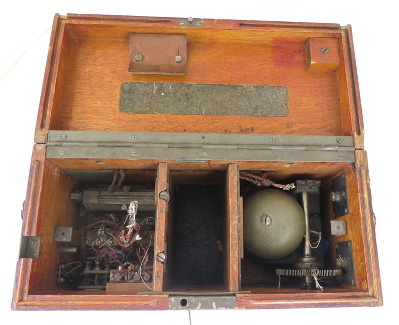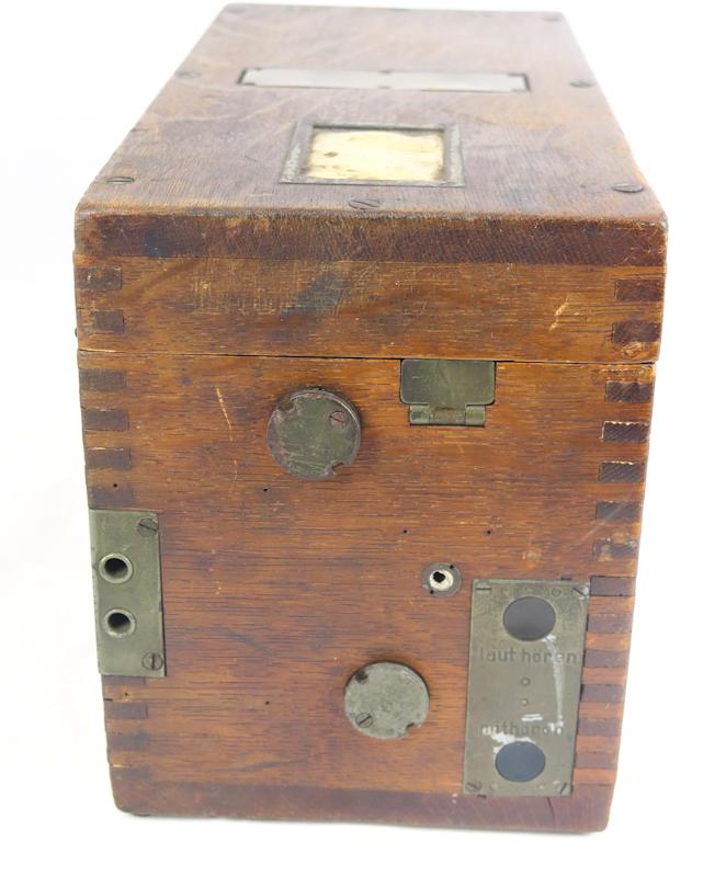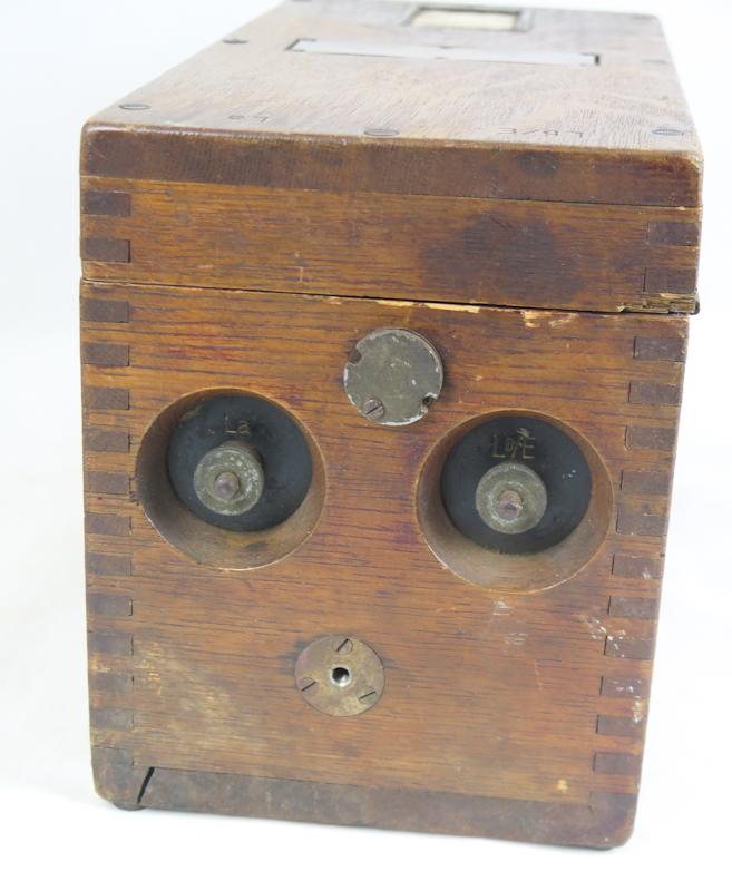 ENG WW1 German Field telephone 16 (Feldfernsprecher 16). Wood case for telephone. Maker markings missing. Most of the techinique inside missing as wooden covers as well. Virtually just an case for telephone. Case has original german alphapetic shield. Someone has added two fake 3rd eagles on case... Reasonable case for display or for spare parts.