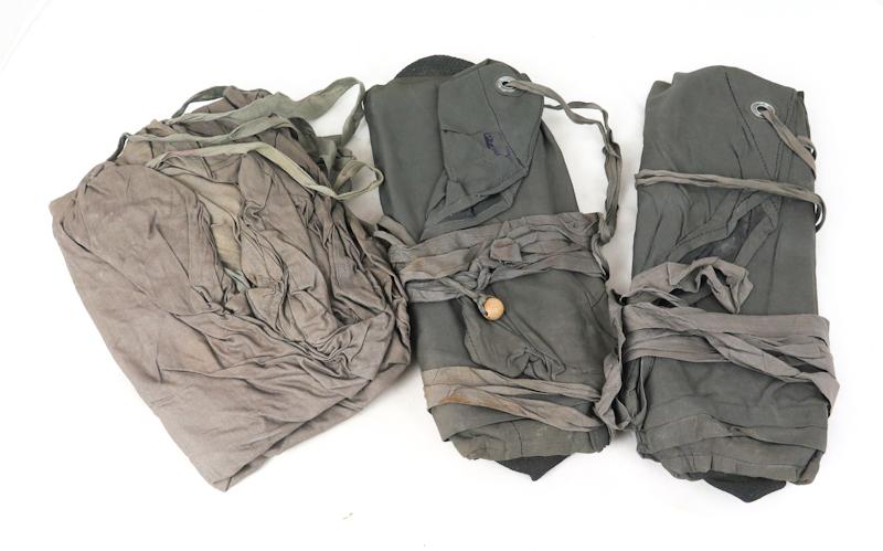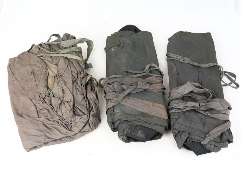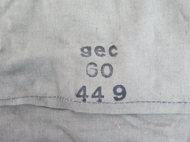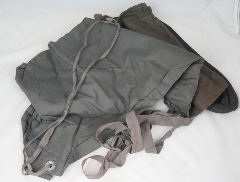 ENG WW2 German M39 light gas suit boots and short pants in carrying pouch. All items grey with rubber lining. Grey boots and pants with rubber lining. Stains. Some stains due storage in front of other boot. No rips or tears. No markings on these two items. Carrying pouch with maker marking and dated, "gec 60 44 9". Maker "Mantel-Meier, Berlin" (gec) and dated 9 1944. Rust on other metal button.. Nice set of original items
