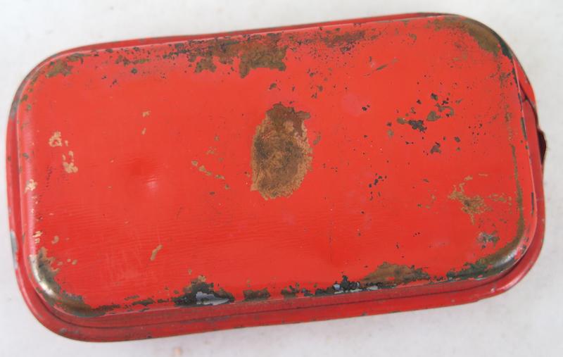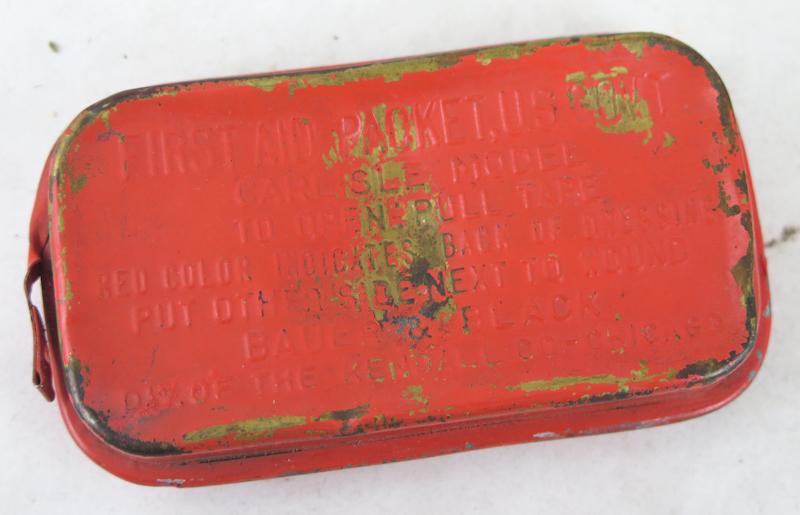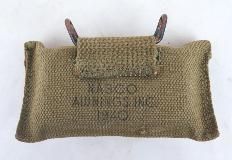 ENG WW2 US Army M1924 1st aid pouch. Khaki pouch, Made in 1940, by Nasco avnings inc . Comes with early orange color metal "Carlisle" 1st aid packet. Worn. Carlisle packet with dents. Nice worn pouch!