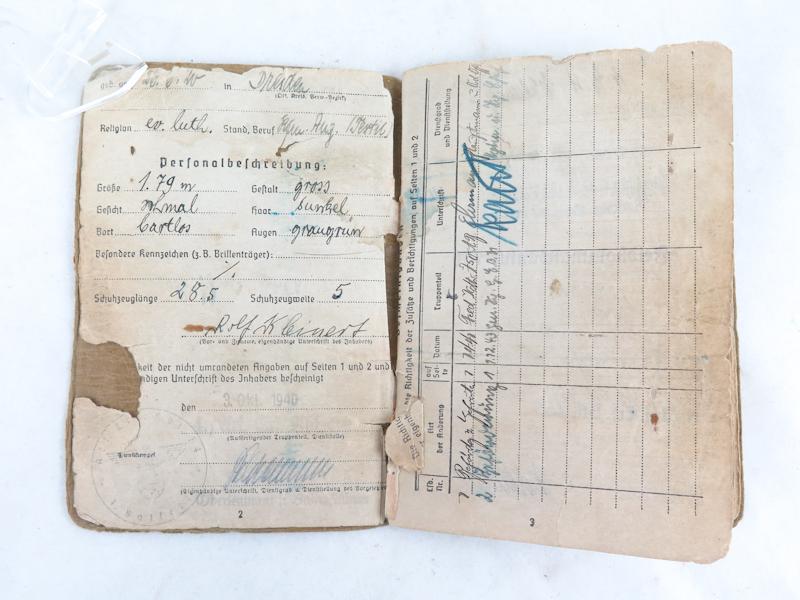 FIN 2MS aikainen Saksan armeijan Soldbuch. Vuodelta 1944, unteroffizier Kleinerth. Jalkaväen yksiköissä ja selustanj oukoissa palvellut. Taistelu yksikkönä on merkitty Feldkommandantur 750 (Vannes) sekä grenadier regiment 515. Kunniamerkeistä ei mainintaa. Aseistus ollut kivääri. Kohtuu siistikuntoinen passi. Hyvä, aito soldbuch.