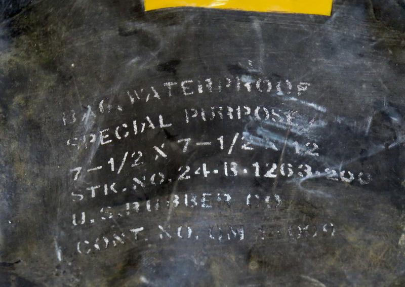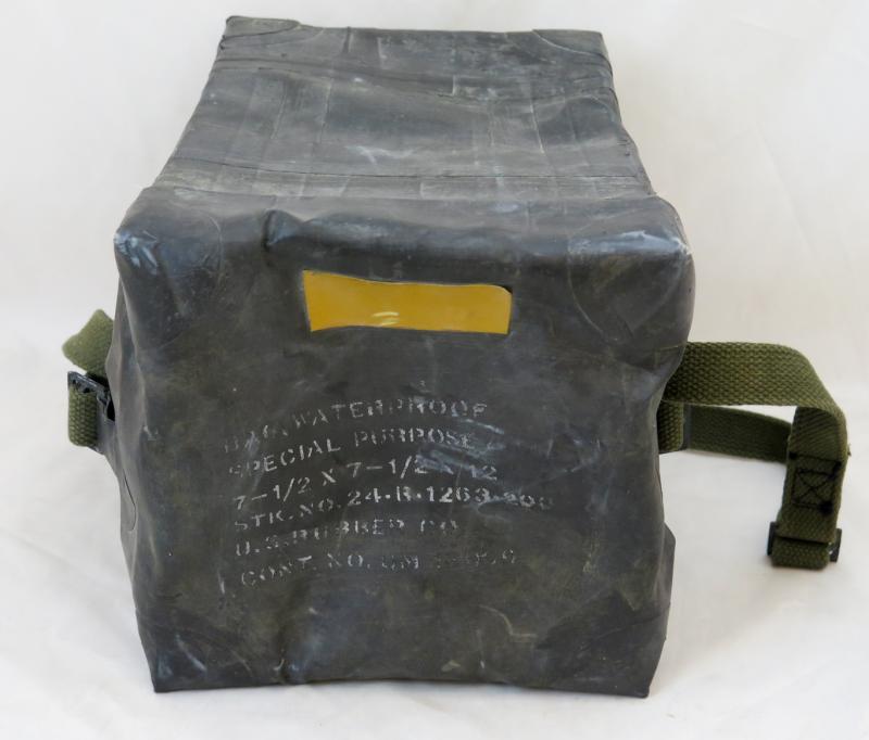 FIN 2MS US armeijan kuminen suojalaukku. Maihinnousu operaatiohin tarkoitettu suojalaukku, joka estää varusteiden kastumisen. Mustaa kumia. Merkitty kanteen Bag, waterproof, special purpose, valmistaja US Rubber co ja valmistussopimus sekä luettelo numero. Vihreät hihnat. Ehjä, hyvä kuntoinen laukku. Suhteellisen harvinainen.