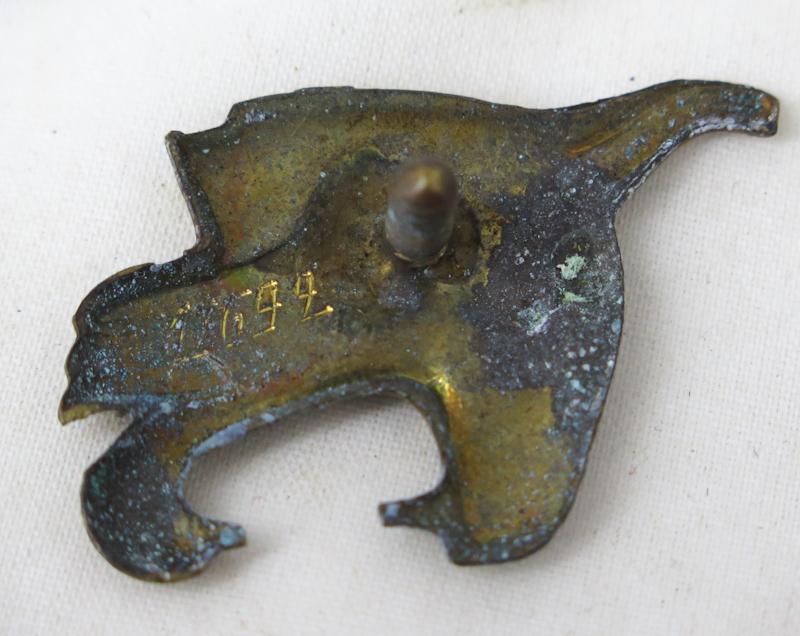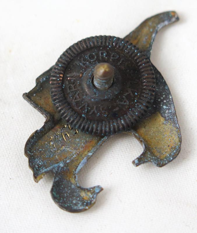 ENG WW2 5.division badge. Known as ”ilves-division” (Lynx). Backside numbered. Screw with text “Korpiselkä – Syväri”. Badge was sometimes used also as cap badge. Nice badge.