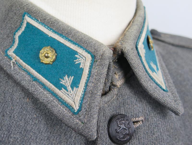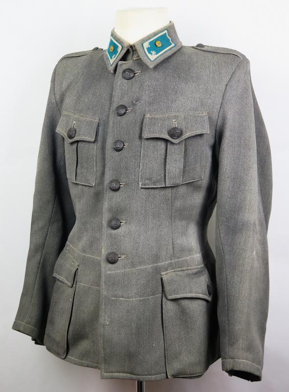 ENG WW2 Finnish infantry 2nd lieutenant M/36-jacket. Grey wool gabardine cloth. Jacket markings worn and difficult to read, size 48 B, int42 (1942), M=sold and maker "Viipurin vaatetehdas". Collar with infantry (green/grey) 2nd lieutenant tabs. Jacket with padded shoulders for personal style. Bakelite buttons. Worn and bleached jacket. Nice officers jacket for uniform collection!