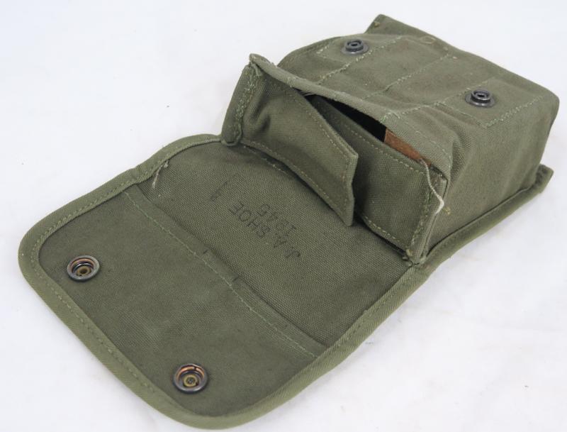FIN US armeijan 2MS aikainen Viidakko ensiaputasku tarvikkeilla. Oliivin vihreä tasku, valmistettu 1945, valmistaja JA Shoe. Taskussa mukana: Hyönteismyrkky( miltei täynnä), Jalkasienen hoito pullo (vajaa), Halazon tabletti purkki, lääketuubi (tyhjä) 3 laastaria sekä ensiside. Hyvä tasku, jossa mukana jokseenkin harvinaiset tarvikkeet.