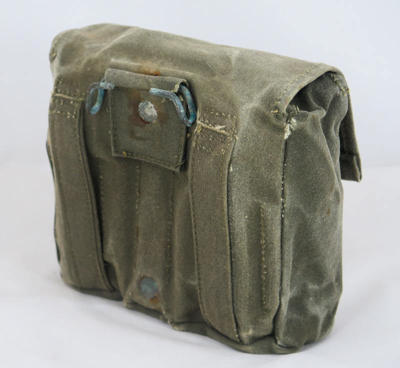 ENG WW2 British folding saw. 1944 dated saw in britihs Jungle green pouch. Saw with handles. Other tools like small file is missing. Surface rust on saw. Maker marked and dated on saw. Worn pouch, maker marking and date unreadable. Fair set.