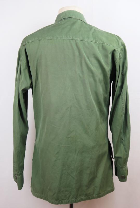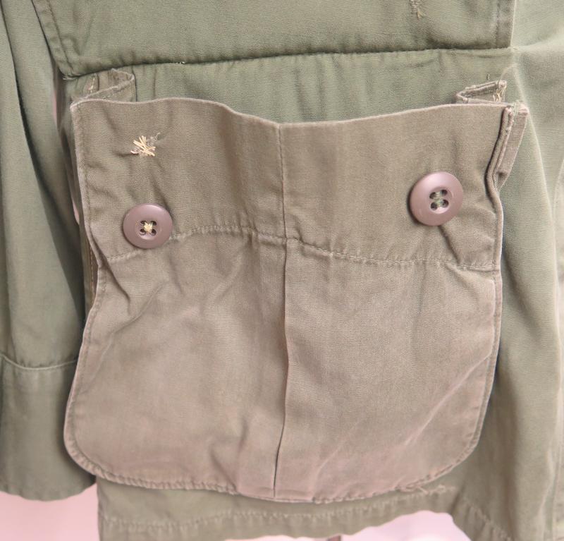 ENG US army jungle jacket. 3rd patttern. Made c. 1966. Size small-regular. Used jacket with repairs. Subdued light colored in-country made  patches name and US ARMY on breast. Left sleeve with subdued  twill 1st aviation brigade patch.  All patches  period sewn. Nice, good looking jungle jacket.