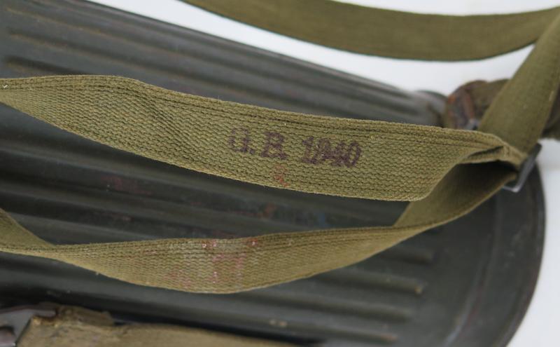 ENG WW2 German Wehrmacht GM30 gasmask set. Matching numbers on canister and on mask "101f". Inside a spare lens cover a name and Feldpost number (56537) for transport unit in Vienna. Gasmask GM30 green canvas/rubber mask in size 2 (medium). Straps in good condition on mask. Filter FE37 is in good condition, unusual white ink marks " 4 1942" on it. Canister is in original color, on bottom another soldier number in white, crossed over. Canister inside aluminium part present. Cleaning cloth metal wire in place. One packet of spare lens cover in a lid box. Straps with some leather protection parts. Long strap dated and maker marked "GB 1940". Nice, very good condition  set.