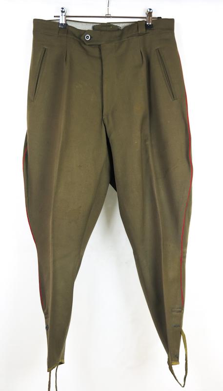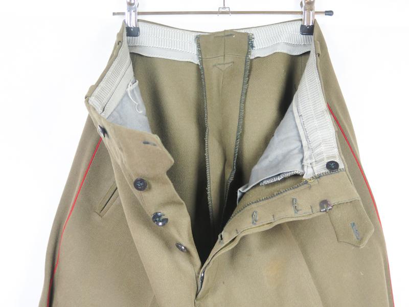 ENG 1950s Soviet M1949 dress uniform. Armored troops senior lieutenat uniform,tunic and breeches. Medium size uniform. Brown cloth tunic with armored troops black velvet collar. Shoulder boards with metal thread embroidered stars, three stars fro senior lieutenant. Tunic with two row buttons. On sleeves lace emblems. Embroidered with metal thread. Red braid on collar and on sleeves. On collar armored troops emblem. Breeches same cloth with red braid. Nice, good condition unusual uniform.