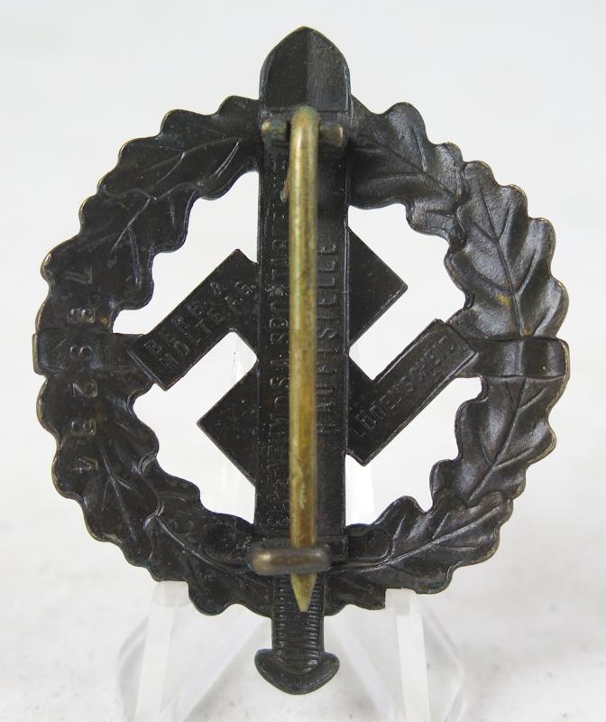 FIN 1930-lukulainen Saksalainen SA (Sturm Abteilung) joukkojen urheilumerkki, "pronssi". 2.Tyypin merkki. Numeroitu ja merkitty taustalle " Eigentum d.S.A Sportabzeichen hauptstelle". Valmistaja " Berg&Nolte, Ludenscheid". Hyvä, aito merkki.