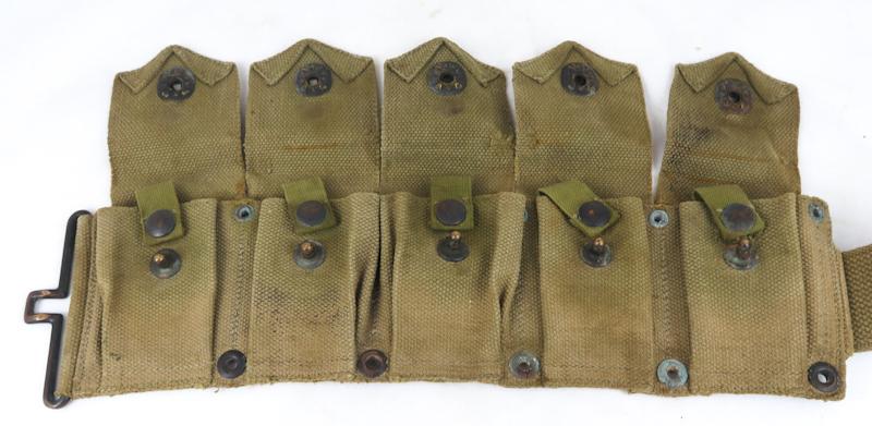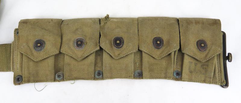FIN 2MS US armeijan M1923 patruunavyö M1 garand kiväärille. 10 taskua patruunoille. Valmistettu vuonna 1941, valmistaja P.M Shoe co. Khakin värinen vyö. Kulunut vyö. Metalliosissa hapettumaa. Kohtuullinen, ehjä vyö.