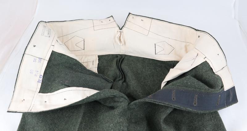 ENG WW2 German Wehrmacht/Waffen-SS M40 trousers. Field grey wool trousers. Excellent, unissued condition. German markings, occupation period maker "Augustinus & Hansen A/S", an danish conglomerate company and made in their owned clothing factory. Waist marked 94cm, depot St42 = Stettin1942. all buttons present. Very good condition trousers, slight odour and feel from wool treatment from the period. Nice pair impossible to upgrade. Rare pair!