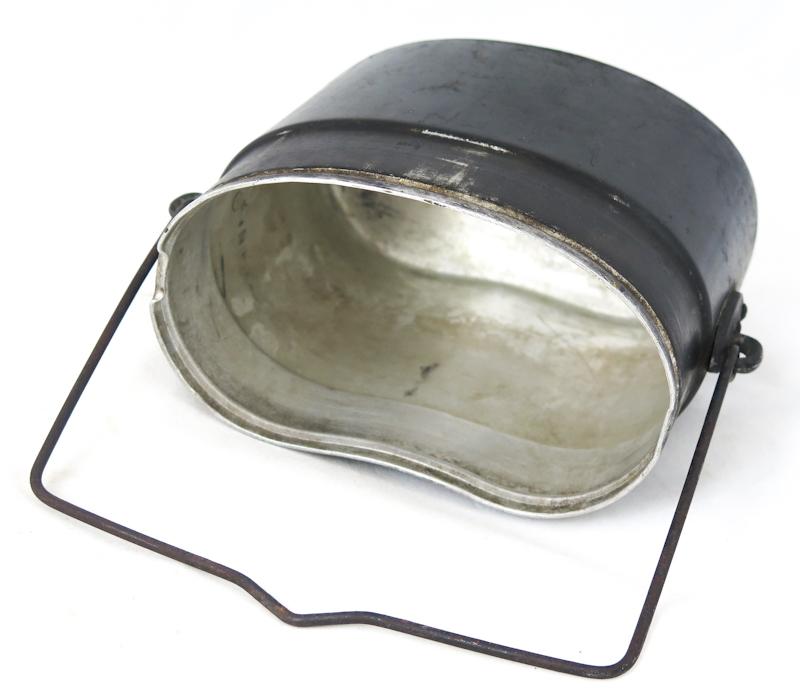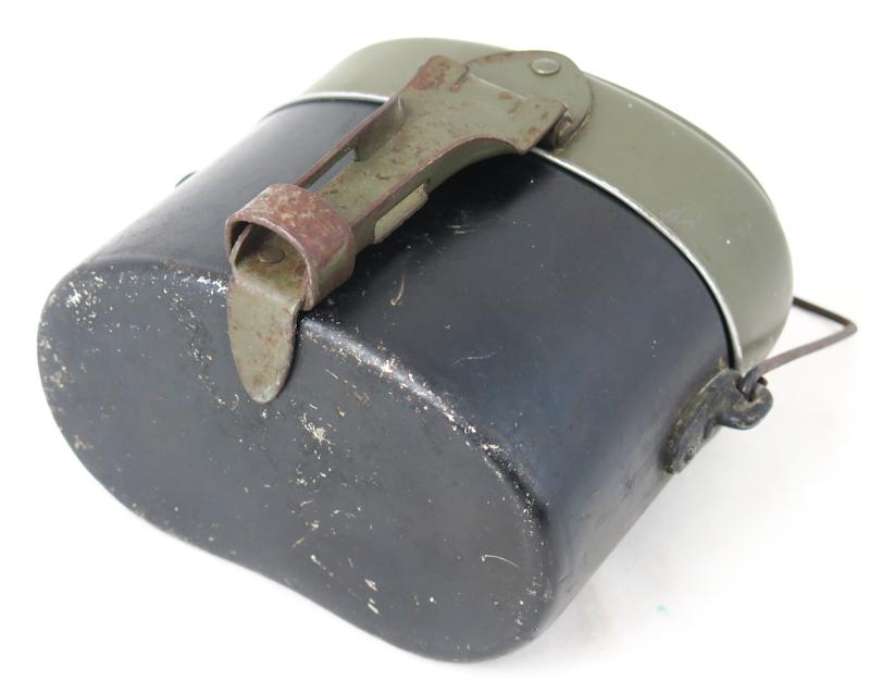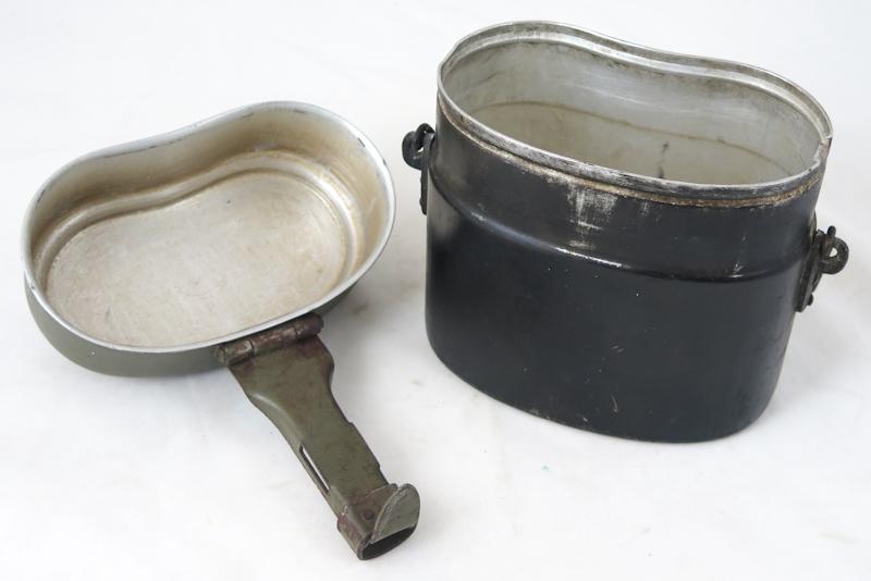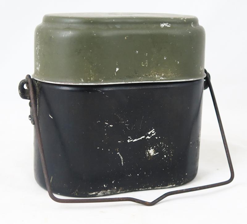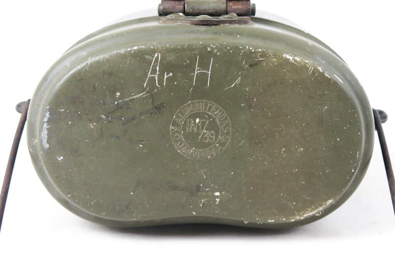 ENG WW2 Finnish army messkit M/28 from 1939. Coverlid stamped INT/39 and with maker "Oy Alumiinitehdas Ab, Järvenpää". Cover green painted, lower part original factory applied black paint. Some initials scratched to messkit. Nice piece to finnish combat gear!