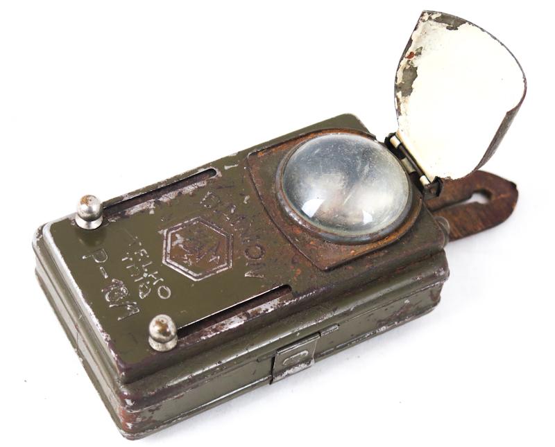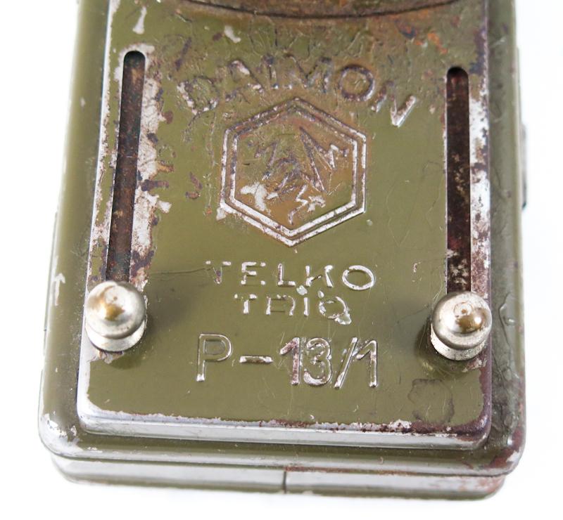 ENG WW2 German "Daimon Telko Trio" flashlight. Finnish army signal corp issued, marked with embossed P-13/1. The P marking type was abolished during WW2 and changed to V-series. Used torch in good to fair condition. Nice finnish army issue flashlight!