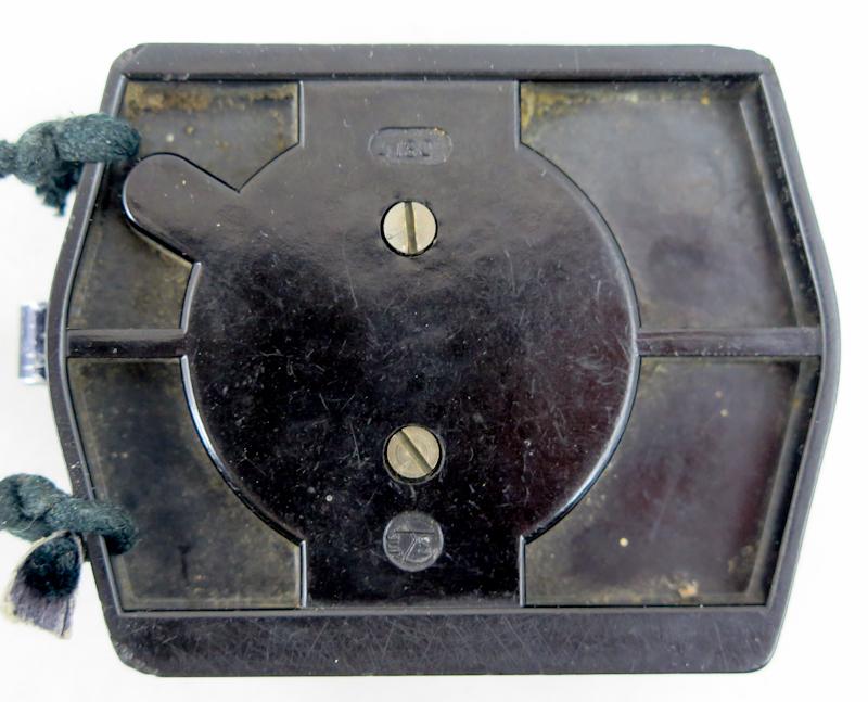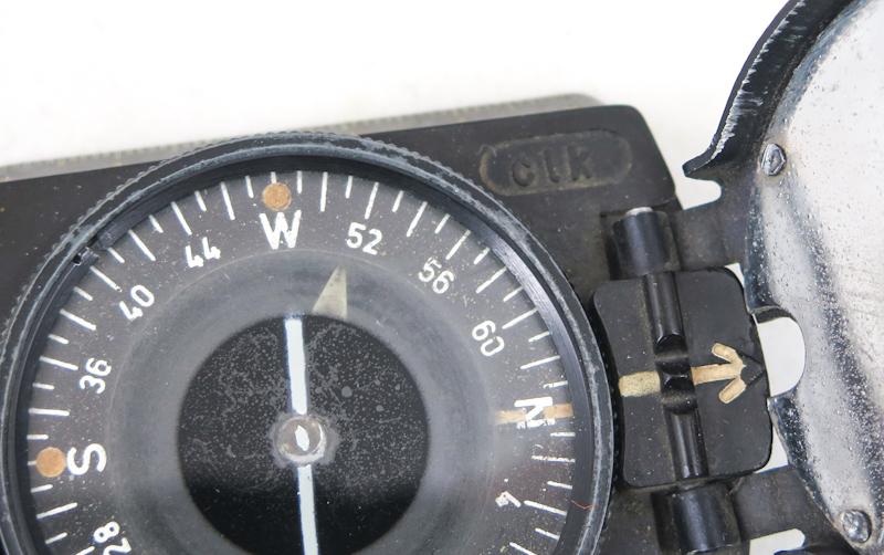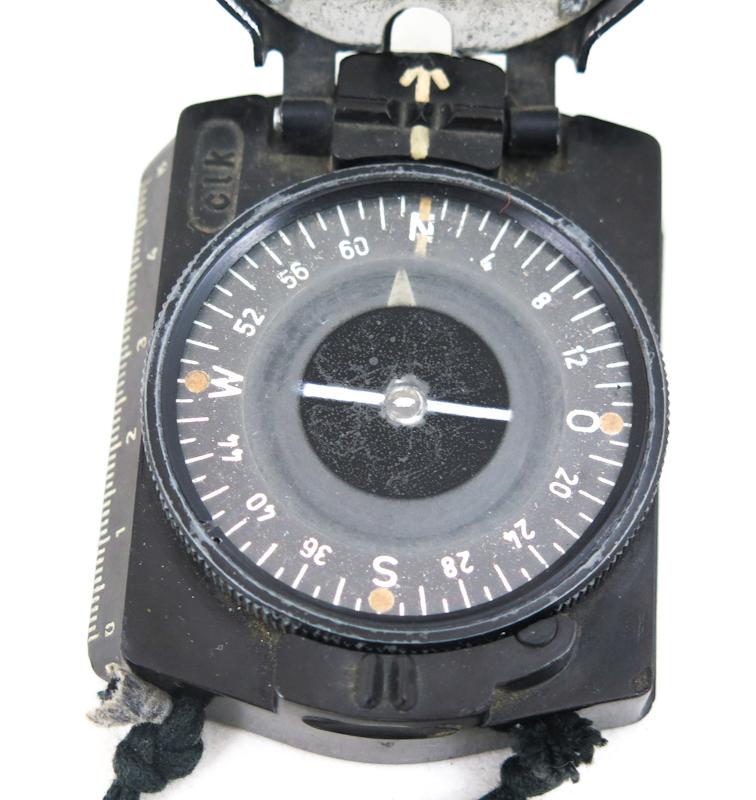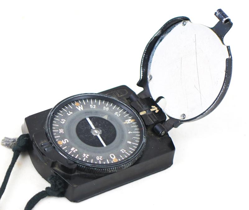 ENG WW2 German Wehrmacht march-compass A. Lid covered bakelite compass with mirror. Compass in working order and on top marking "A". Marked "clk= F.W. Breithaupt&sohn". Used compass with black cord, IMO modern. Good addition to officers gear!