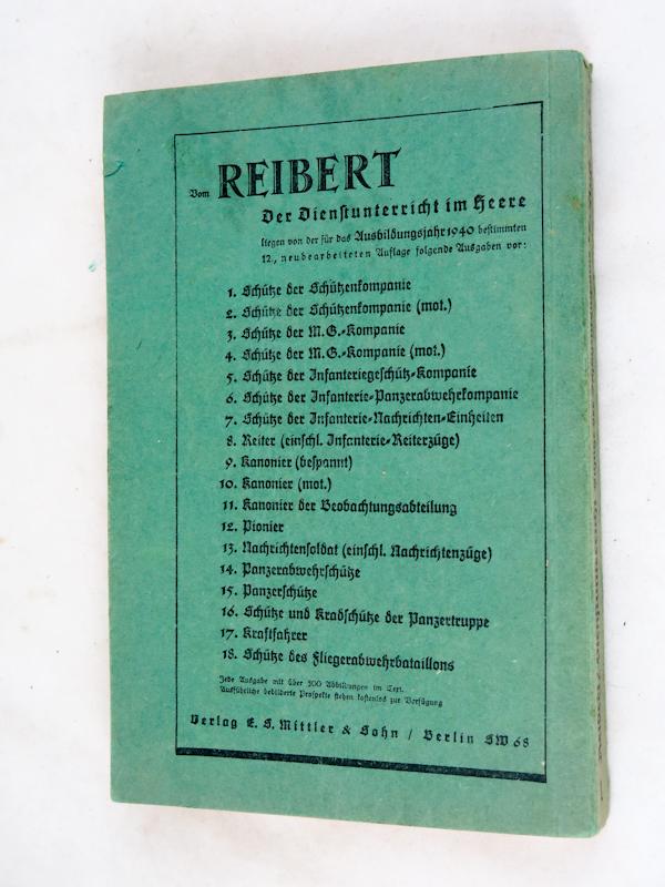 FIN 2MS Saksalainen sotilaan käsikirja Reibert-sarjaa vuodelta 1940. Moottoroidun jalkaväen sotilaalle tarkoitettu. Sisältää kaikkia sotilaselämään liittyvää tietoutta kasarmilta, varsuteista, tekniikkaa, jne. Koko DIN A5. Ehjä kirja, sivut tallella. Hyvä, mielenkiintoinen kirja.