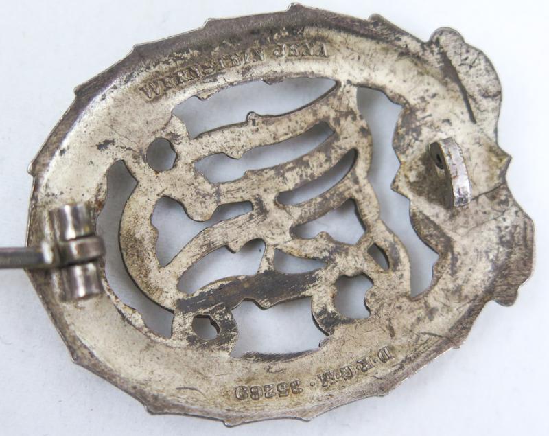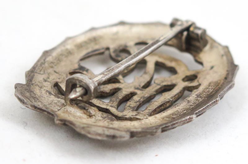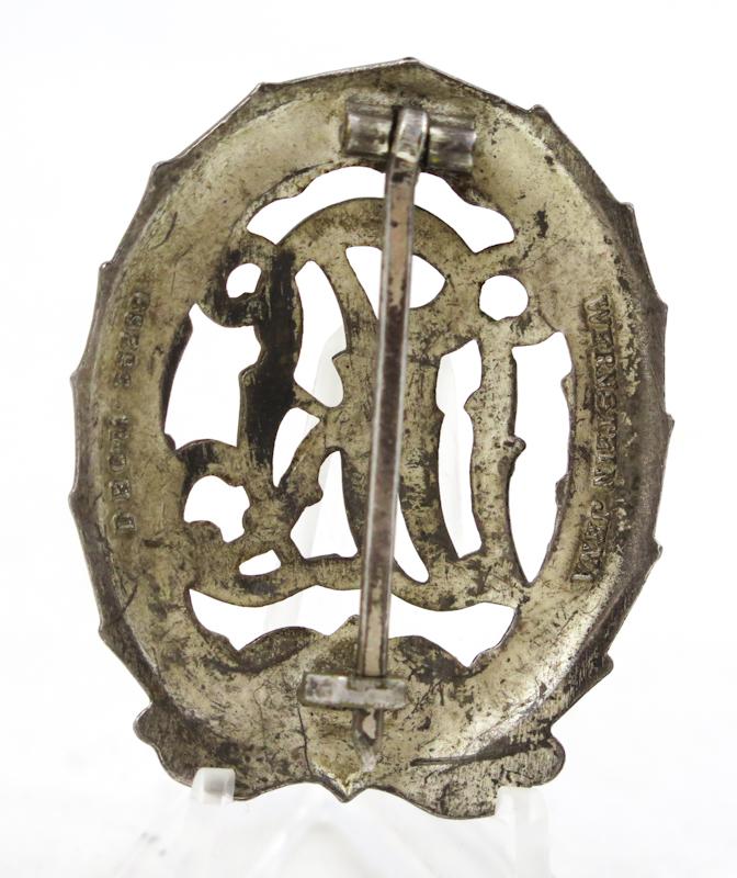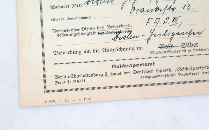 ENG WW2 German National sport badge. 2nd class in silver with award document. Badge having monogram "DRL" = Deutscher Reichsbund für leibesübungen. Badge maker marked Wernstein, Jena. Award document foldable, inside sporting entries. Achieved the silver grade. Good original badge. Universally worn by soldiers.