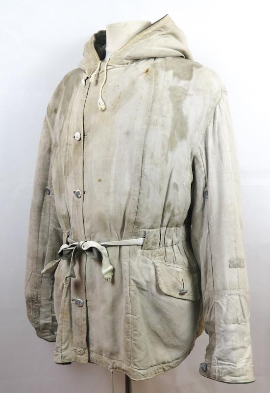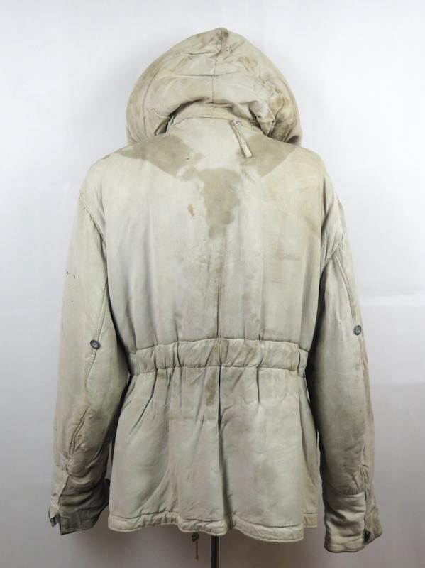 ENG WW2 issue German Wehrmacht army and Waffen-SS type parka. Reversible mouse-grey jacket with whiteside. Jacket is made from thick wool cloth, which typical for early issued parka´s(1942). Parka is in good shape, no major dames. The parka has period repair on sleeves with extension with wool cloth to cuffs. Jacket has original applied buttons. The jacket has no well visible markings, only faint roman "II" for size can be seen. White side is dirty.. The jacket has been used on collectors mannequin and show stains from leather fieldgear (Y-strap´s, holsters etc.). Size is medium/large. Model of the jacket is the same what Finnish SS-volunteers used. Nice, mid-war grey parka.