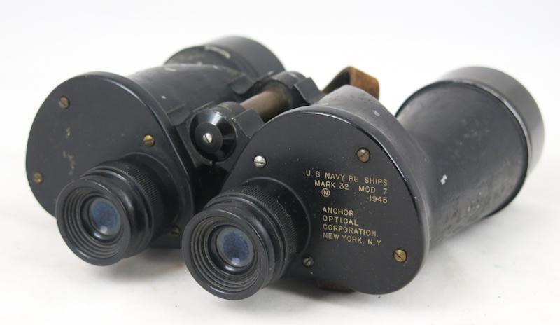 ENG WW2 US Navy BU Ships Mark 32 mod. 7 binoculars. Dated 1945. Maker "Anchor Optical Corporation, New York". Optic is in good order. Leather strap. OD plastic case M63E1 from 1970s. Good conidtion some chalked text on cover. Good to fair set of binos