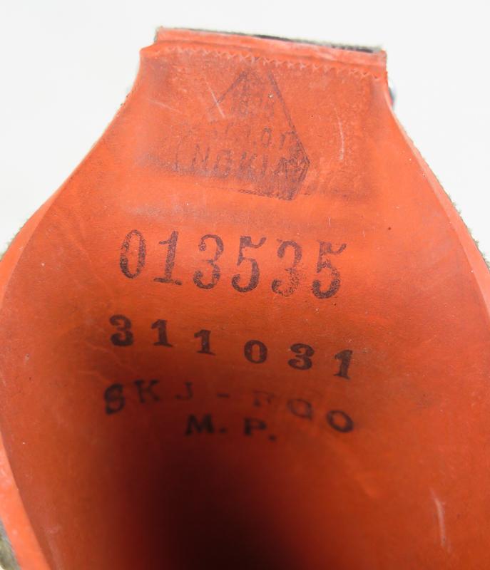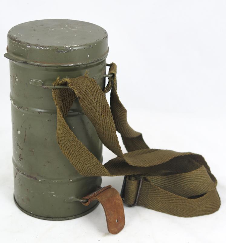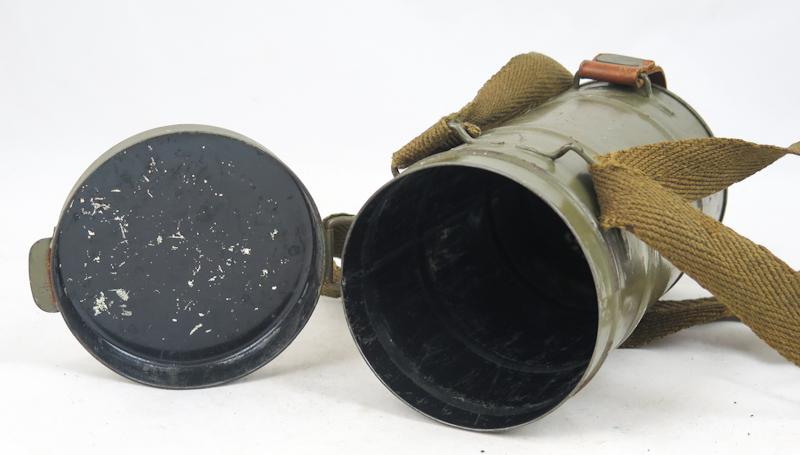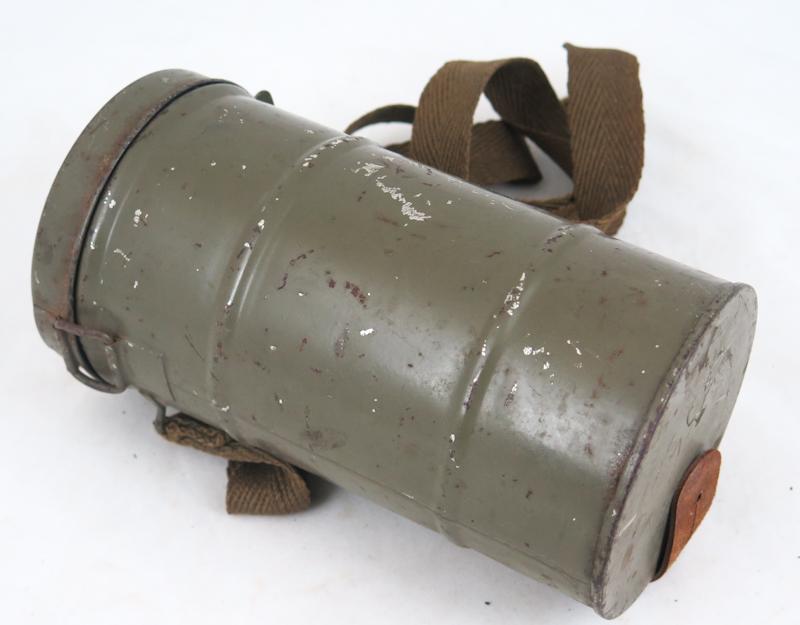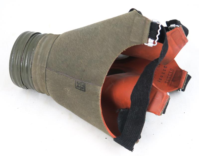 ENG Pre-war finnish civil defense gasmask M/32. Nokia made rubber mask covered with brown-greenish canvas. Good condition mask. The straps are lost some of their flexibility in time. Olive colored metal canister with straps. This mask was used by Civil guards and Lotta Svärd organisations. Very nice gasmask!
