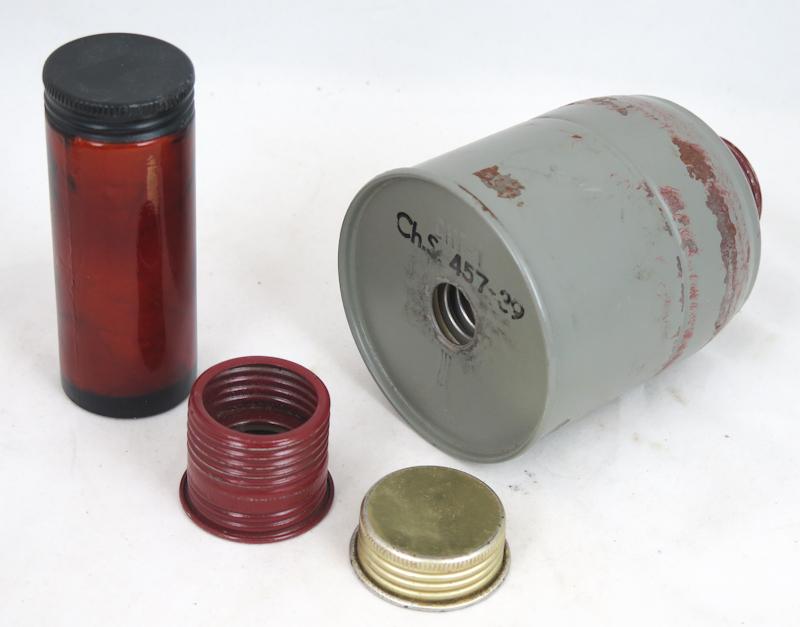 FIN 2MS Suomen armeijankin käyttämä kaasunaamari mallia/F. F= Fatra, tsekkiläisen Fatran ja Cheman valmistamia naamareita hankittiin Talvisodan aikana. Cheman LidMa kaasunaamari. Naamari ja suodatin leimattu 1939. Kiristys nauhat toimivat. Suodattimessa Cheman leimat. Naamarin koko 3, eli pieni. Laukku harmaa yksinkertaistettu malli D laukku, jossa tasku naamarille ja vaunupullolle. Mukana vanupullo, suodatin kasvo-osa sekä liitin suomalaisille suodattimille. Laukku käytetty. Viimeisenä SA-kuva jossa Malli F käytössä. Hyvä sodan ajan kaasunaamari.
