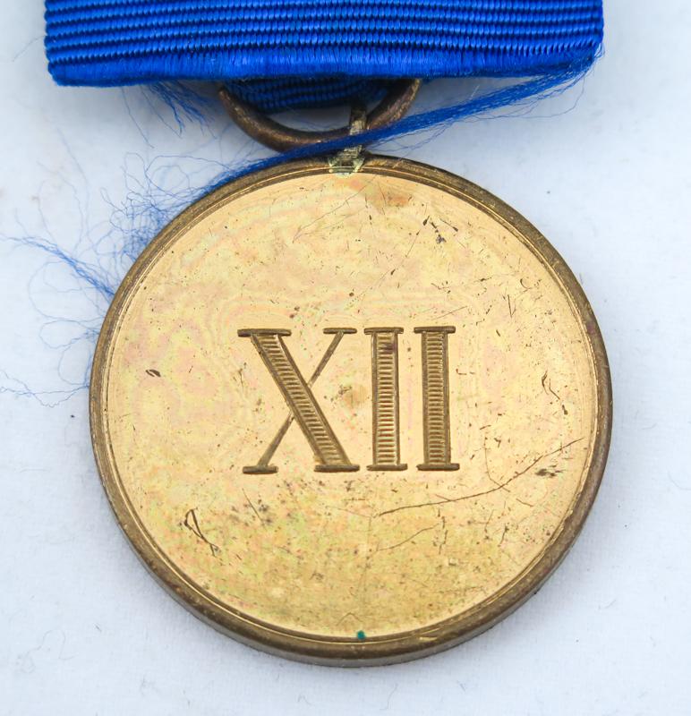 FIN 1MS Saksan Preussin asevoimien 12.Vuoden palvelusmitalli miehistölle ja aliupseereille. Pronssin värinen mitalli. Sininen nauha. Kulunut paikoin, patinaa. Hyvä, aito, merkki.